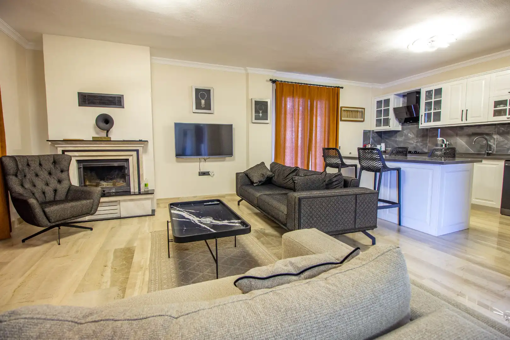 - 1 Çift Kişilik Yatak, 2 Komodin, Elbise dolabı, Makyaj Masası, Klima,