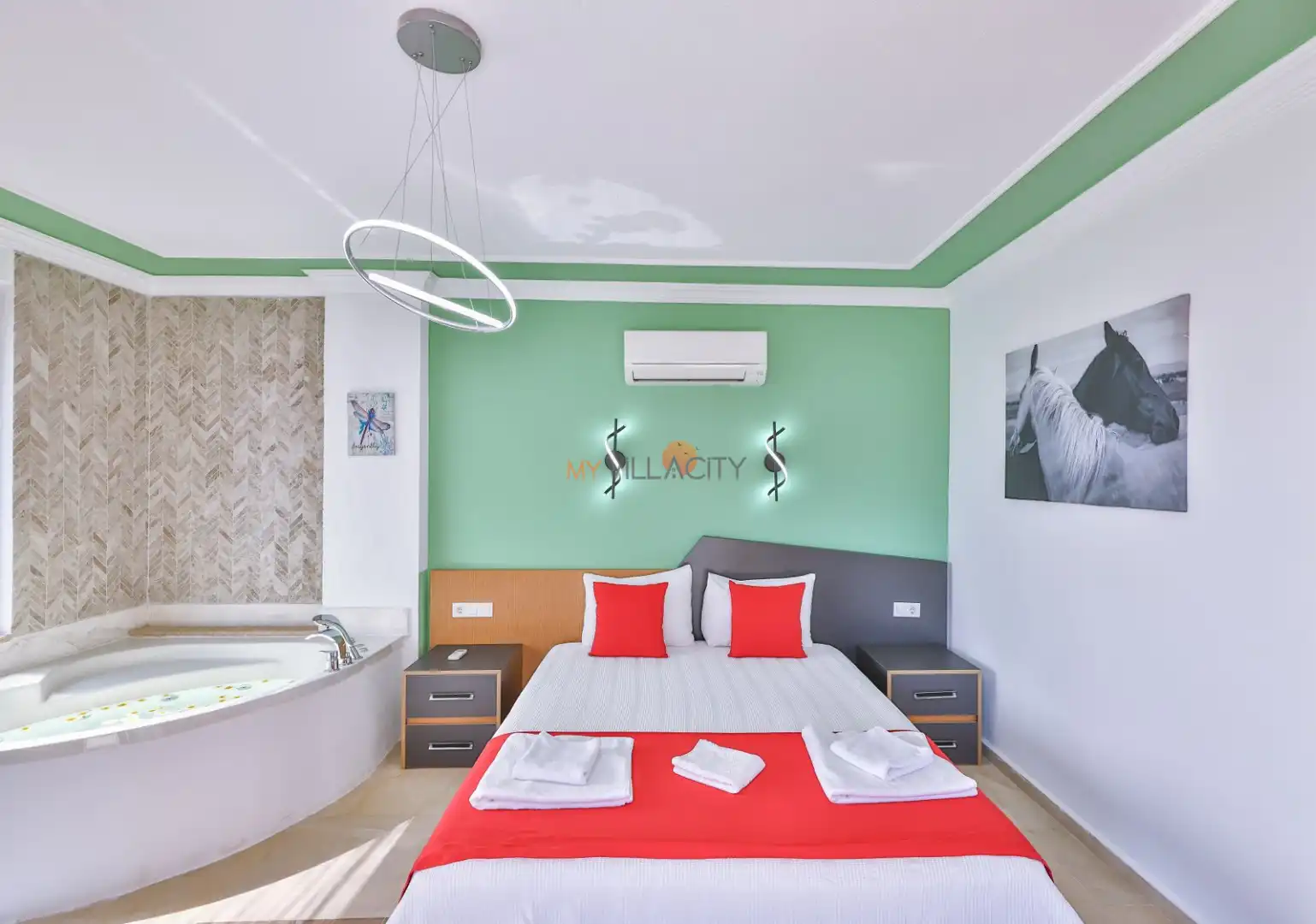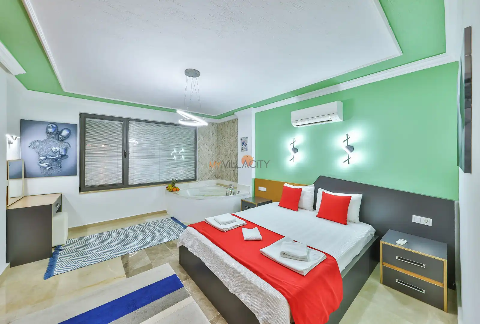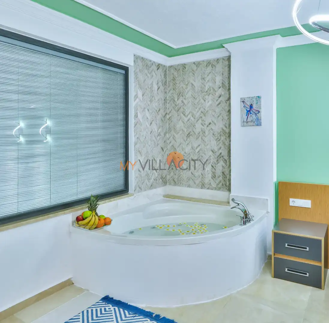 - 1 Çift Kişilik Yatak, 1 Jakuzi, 1 Banyo/WC, 2 Komodin, Elbise dolabı, Makyaj Masası, Klima,