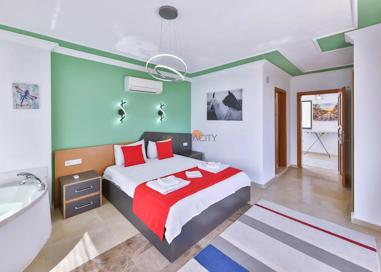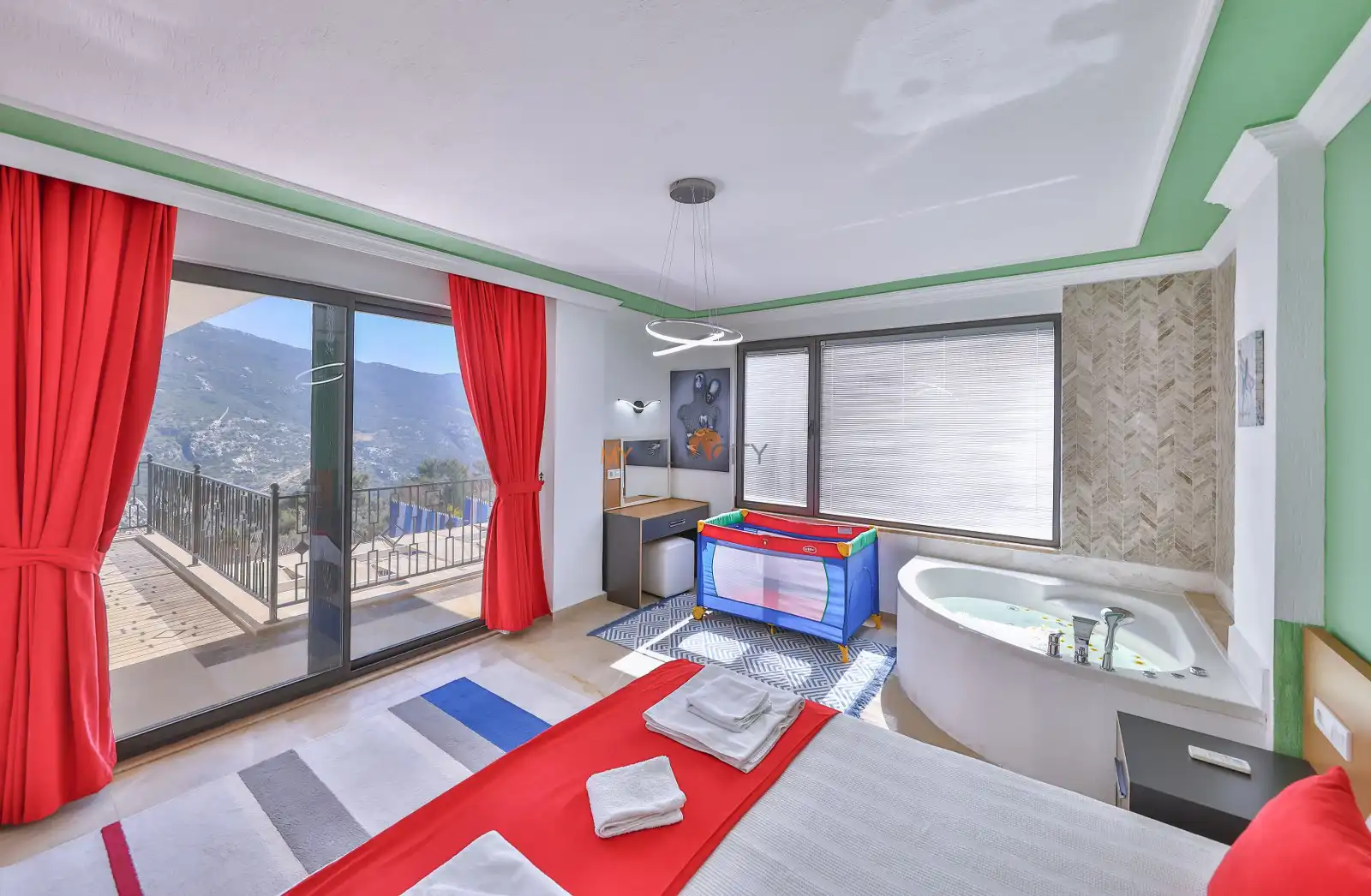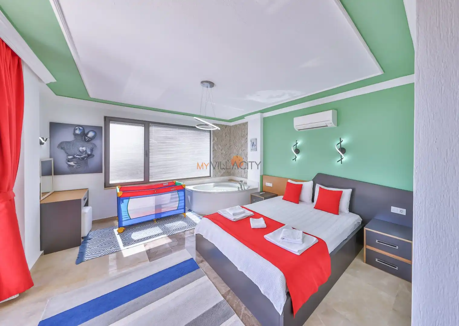 - 1 Çift Kişilik Yatak, 1 Jakuzi, 1 Banyo/WC, 2 Komodin, Elbise dolabı, Makyaj Masası, Klima,
