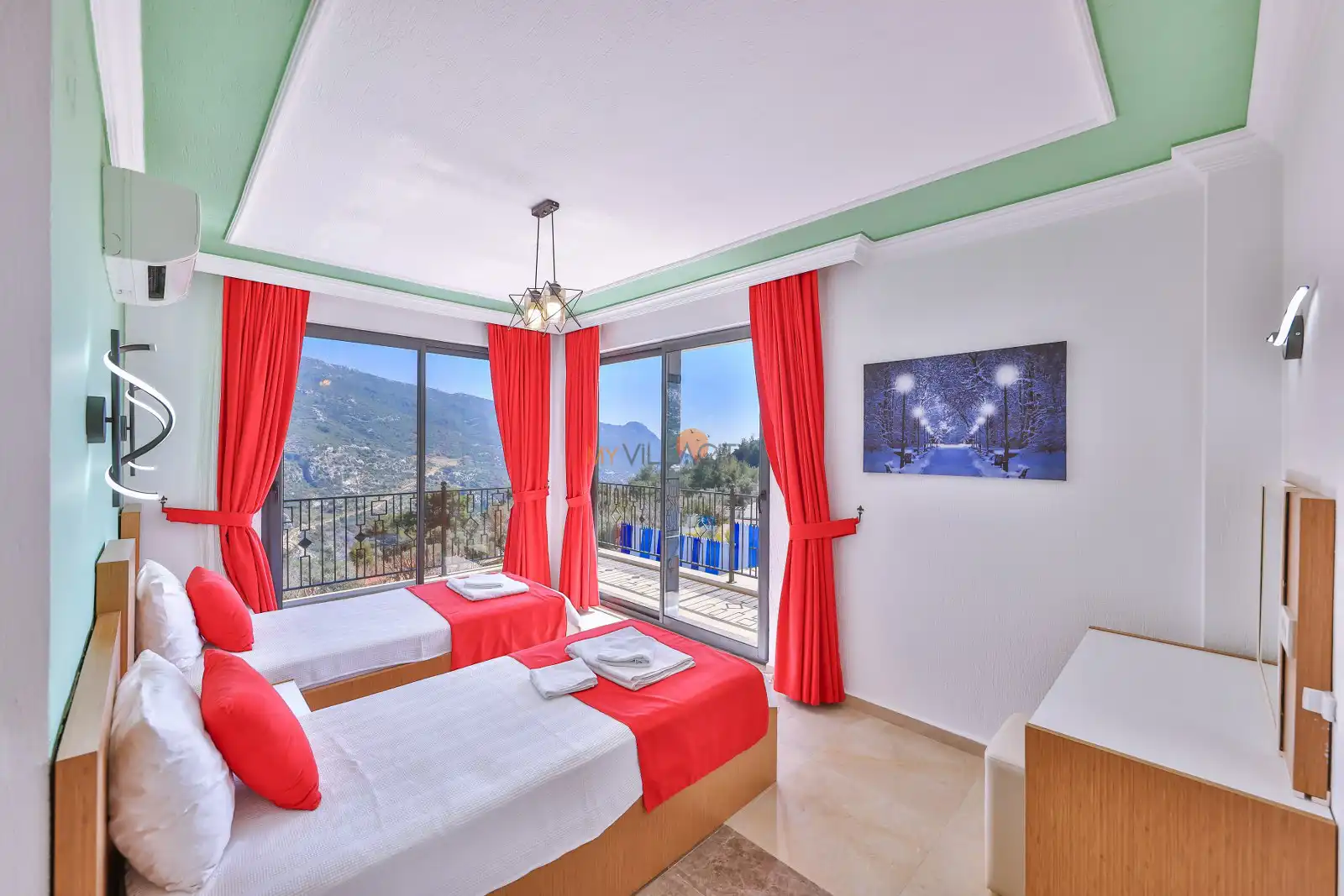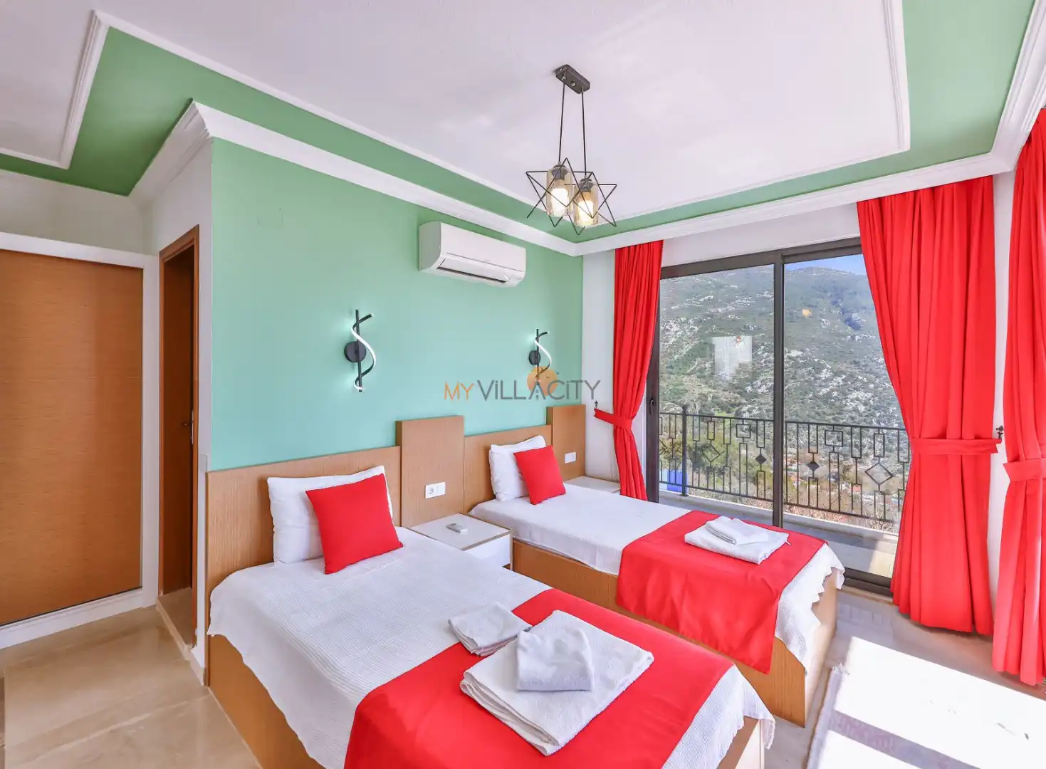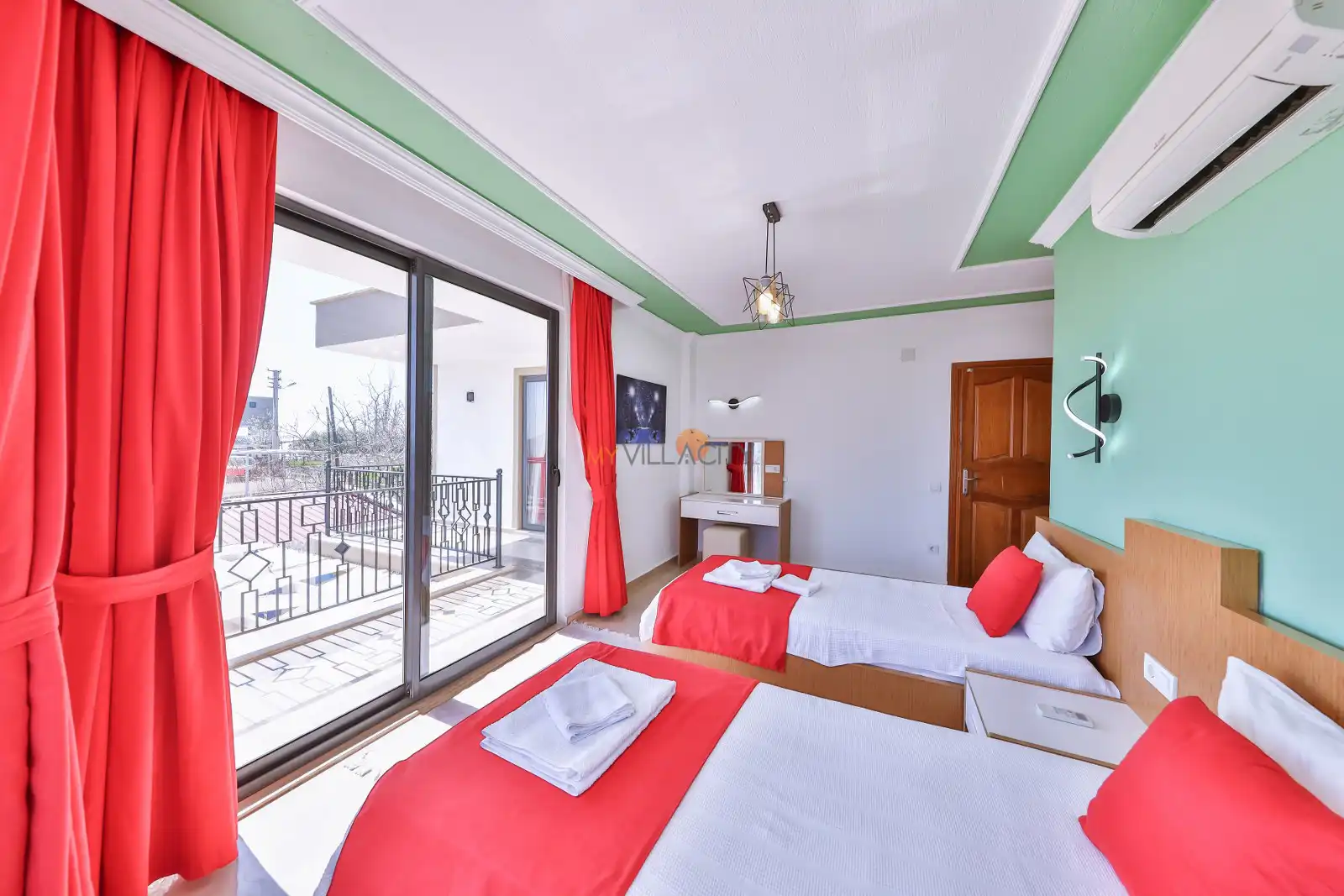 - 2 Tek Kişilik Yatak, 1 Banyo/WC, 2 Komodin, Elbise dolabı, Makyaj Masası, Klima,