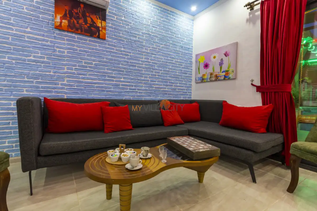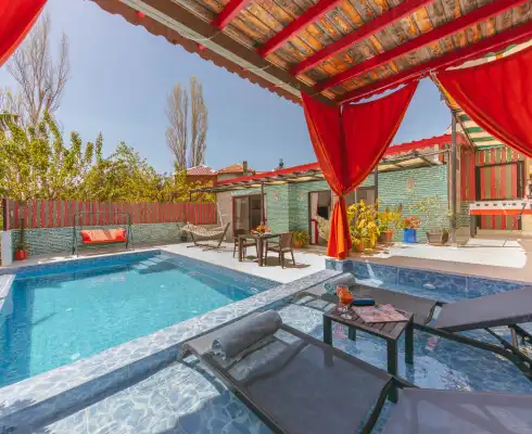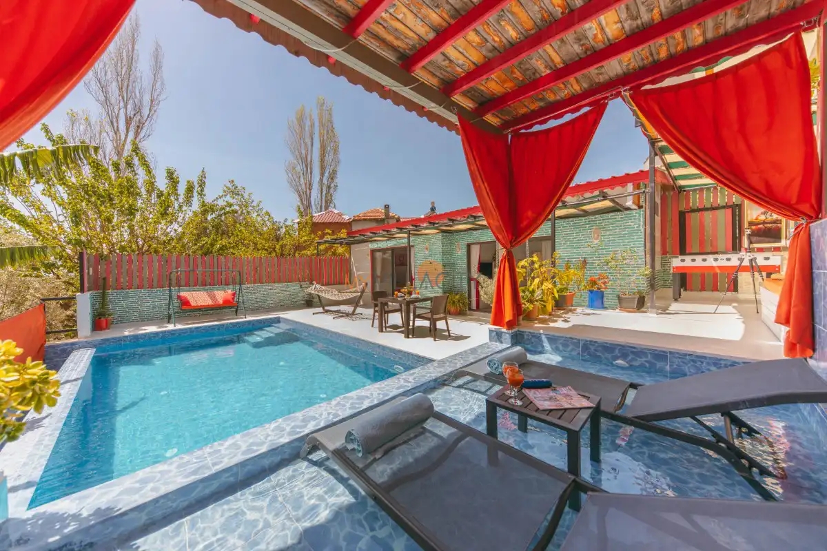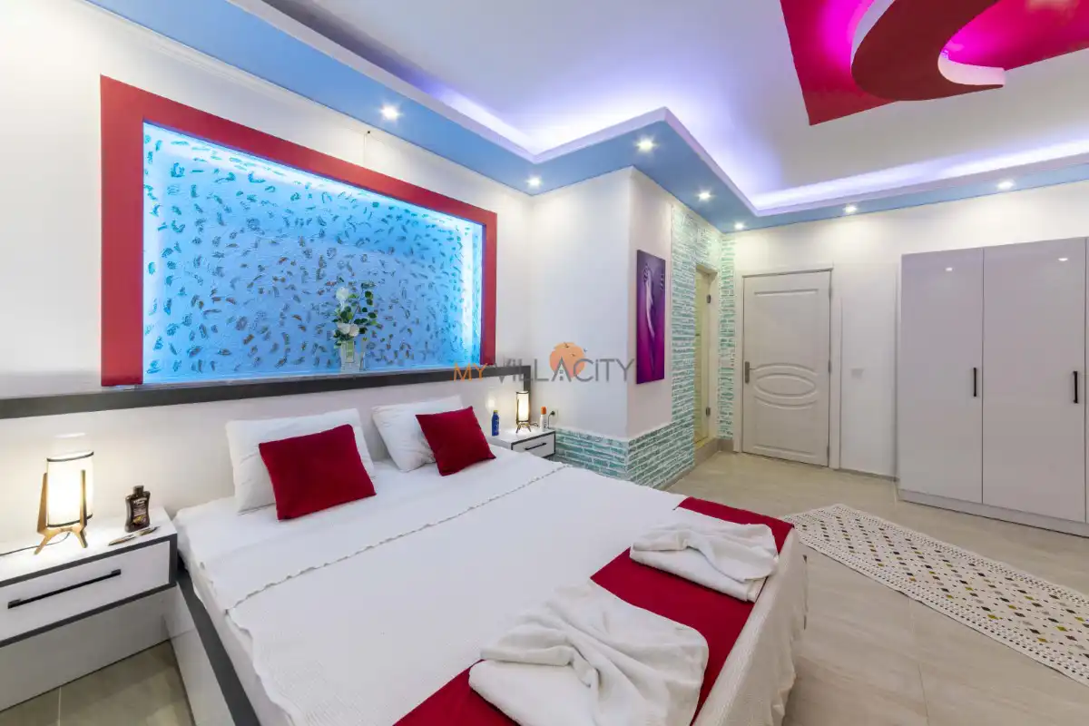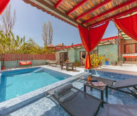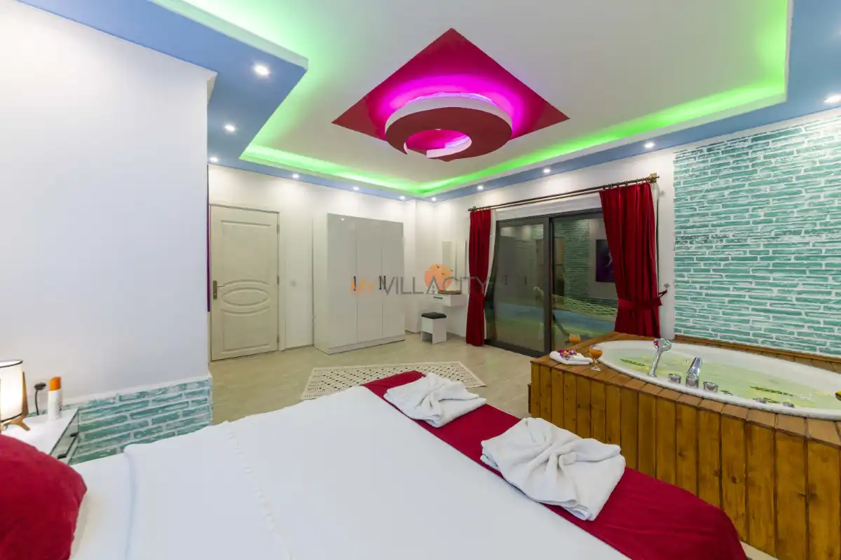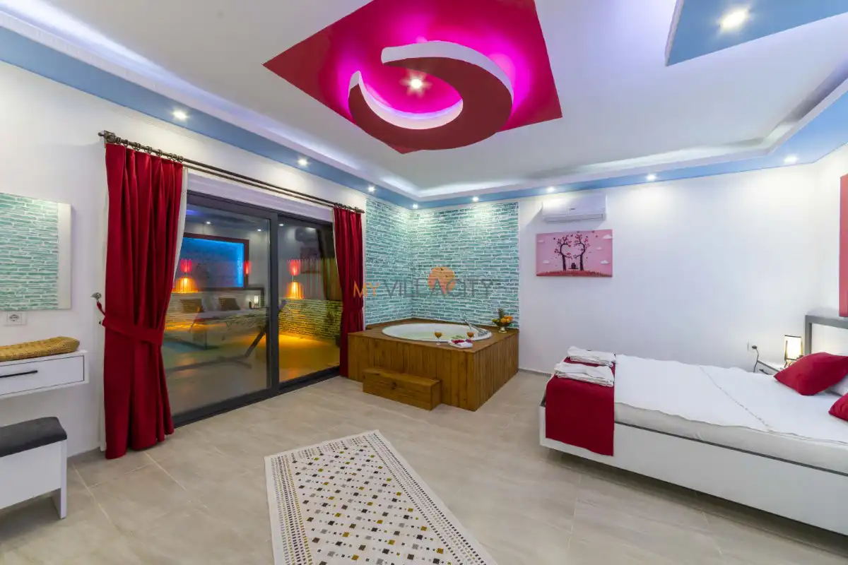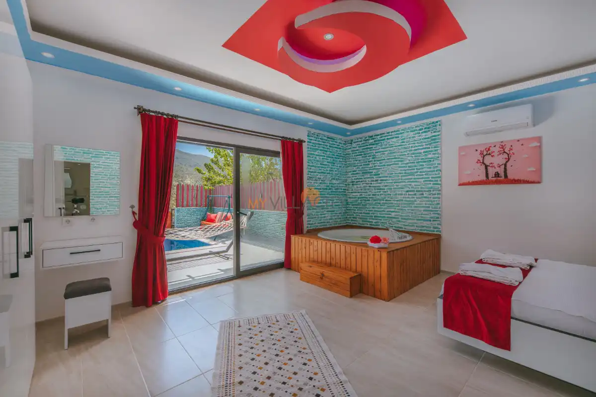 1 yatak odası ve 2 kişilik konaklama kapasitesine sahip olan villamız, modern ve konforlu detaylarla özenle dizayn edilmiştir. Özellikle kırmızı tonların hâkim olduğu şık yatak odasında yer alan jakuzi, tatilinize romantik bir dokunuş katarken günün yorgunluğunu keyifle atmanıza imkân tanır.