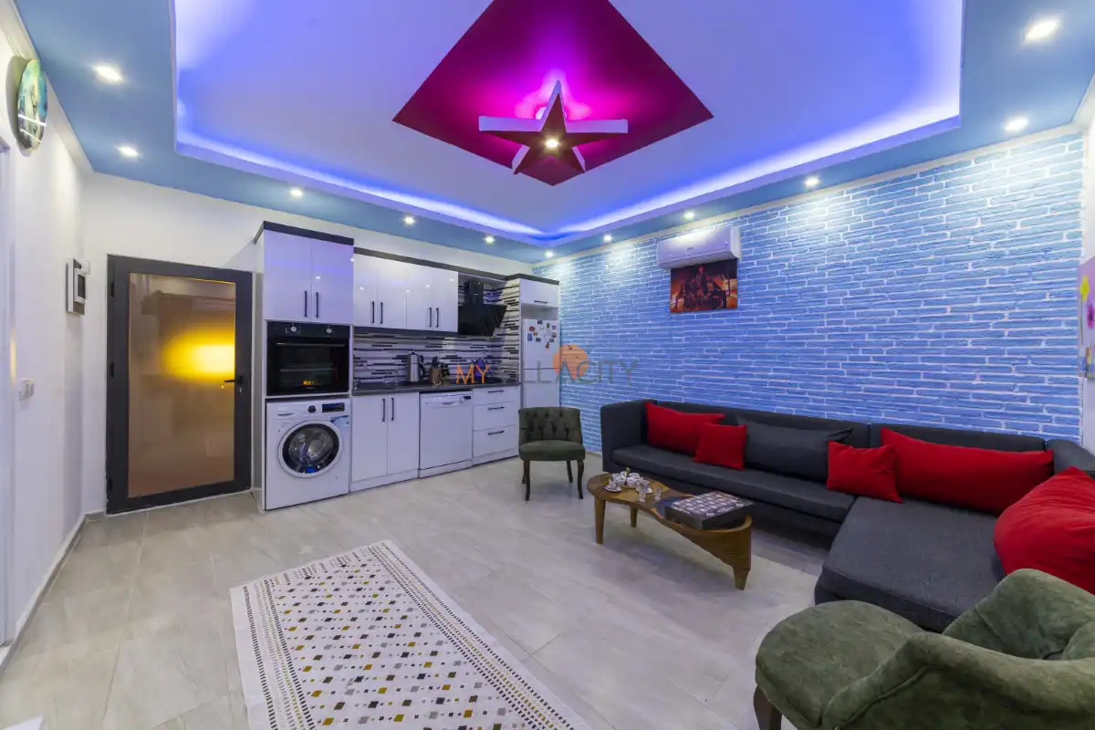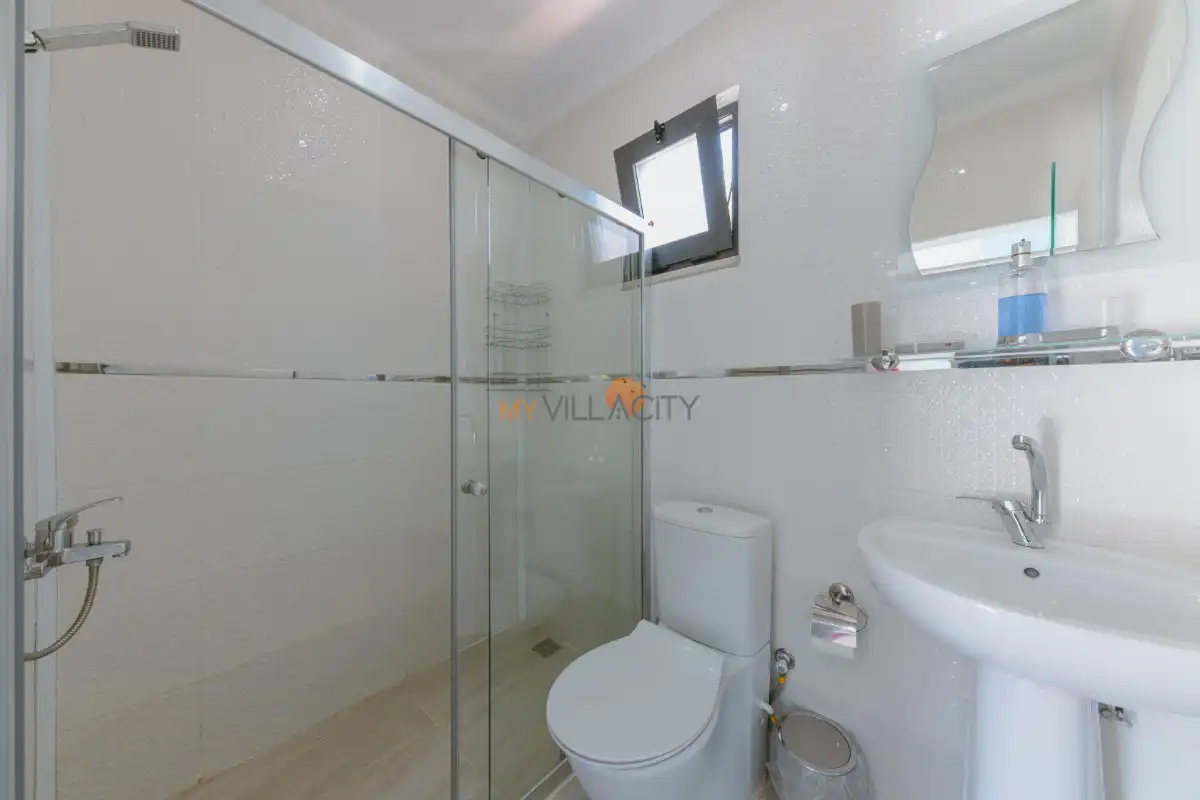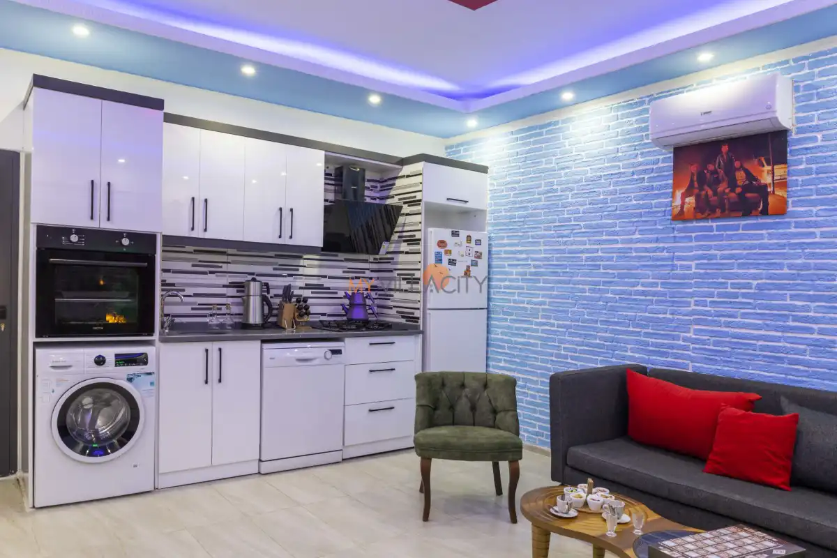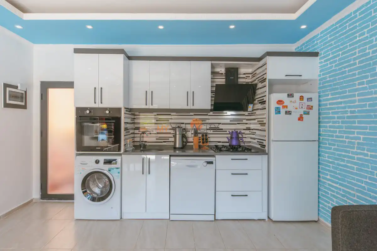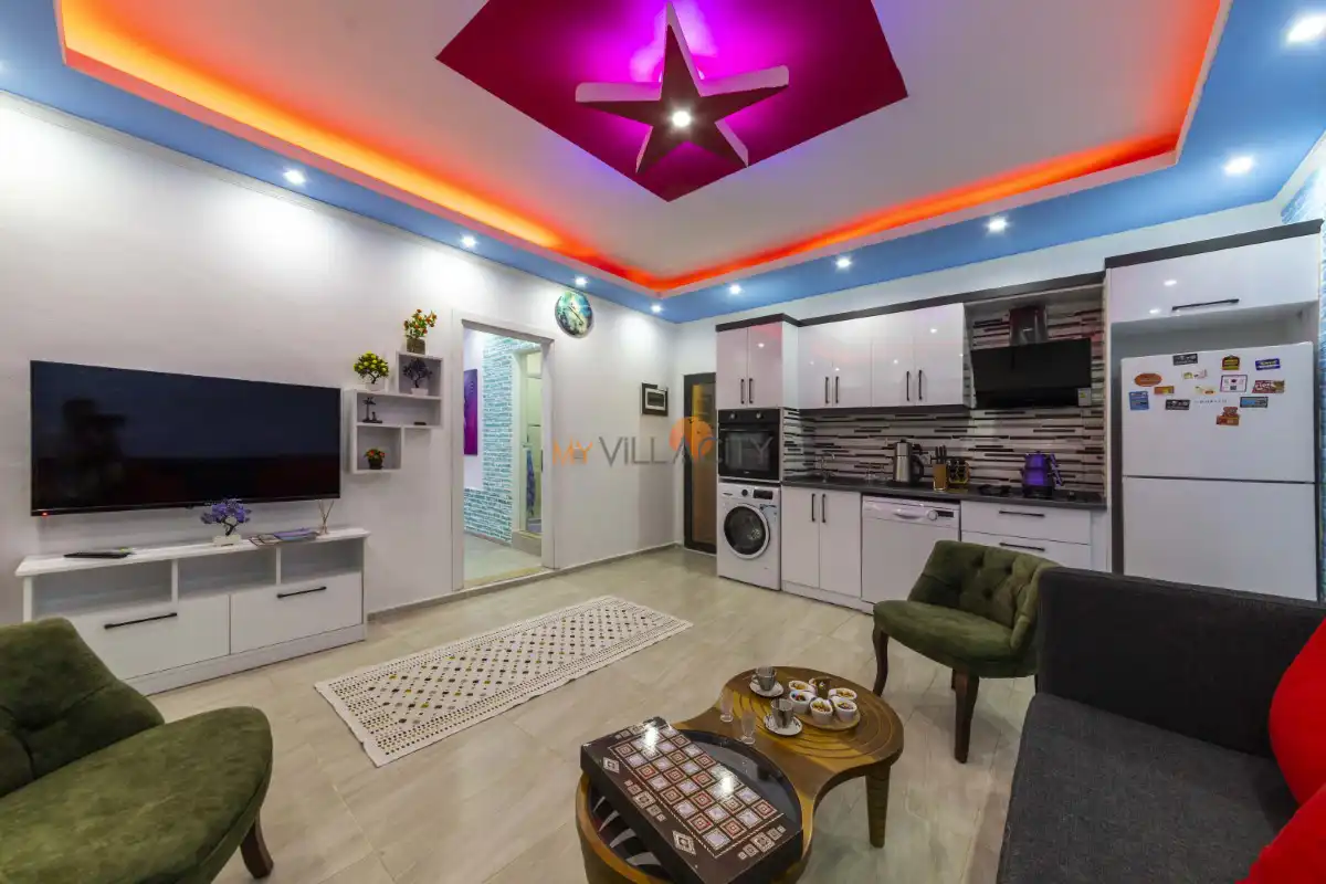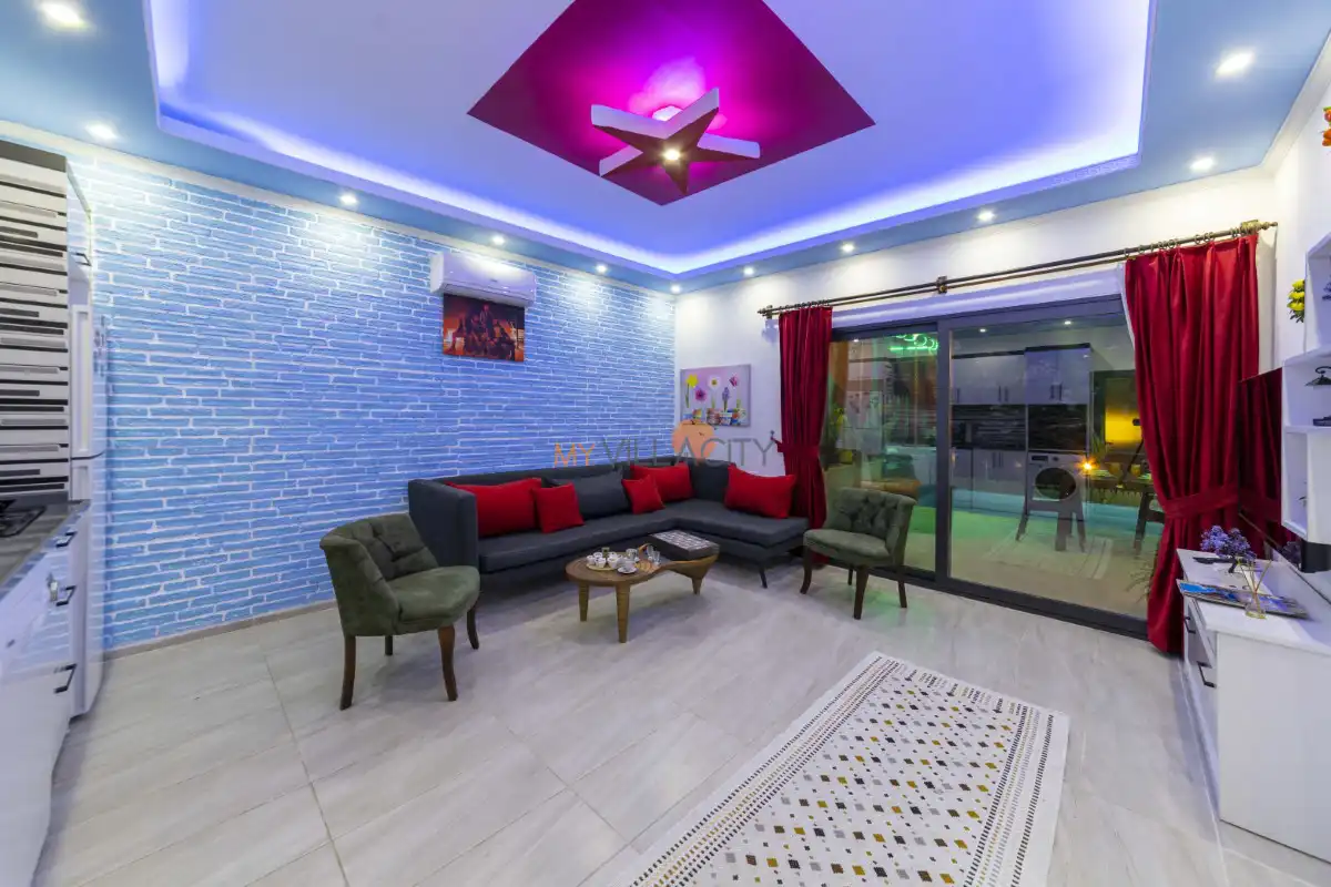 Modern Amerikan mutfağı; buzdolabı, bulaşık makinesi, çamaşır makinesi, ocak, fırın, mikrodalga, su ısıtıcısı ve gerekli tüm mutfak ekipmanlarıyla donatılmıştır. Konforlu oturma grubuna sahip salon alanında TV, uydu alıcısı ve klima bulunmakta olup, salondan doğrudan havuz terasına çıkış imkânı sunulmaktadır.