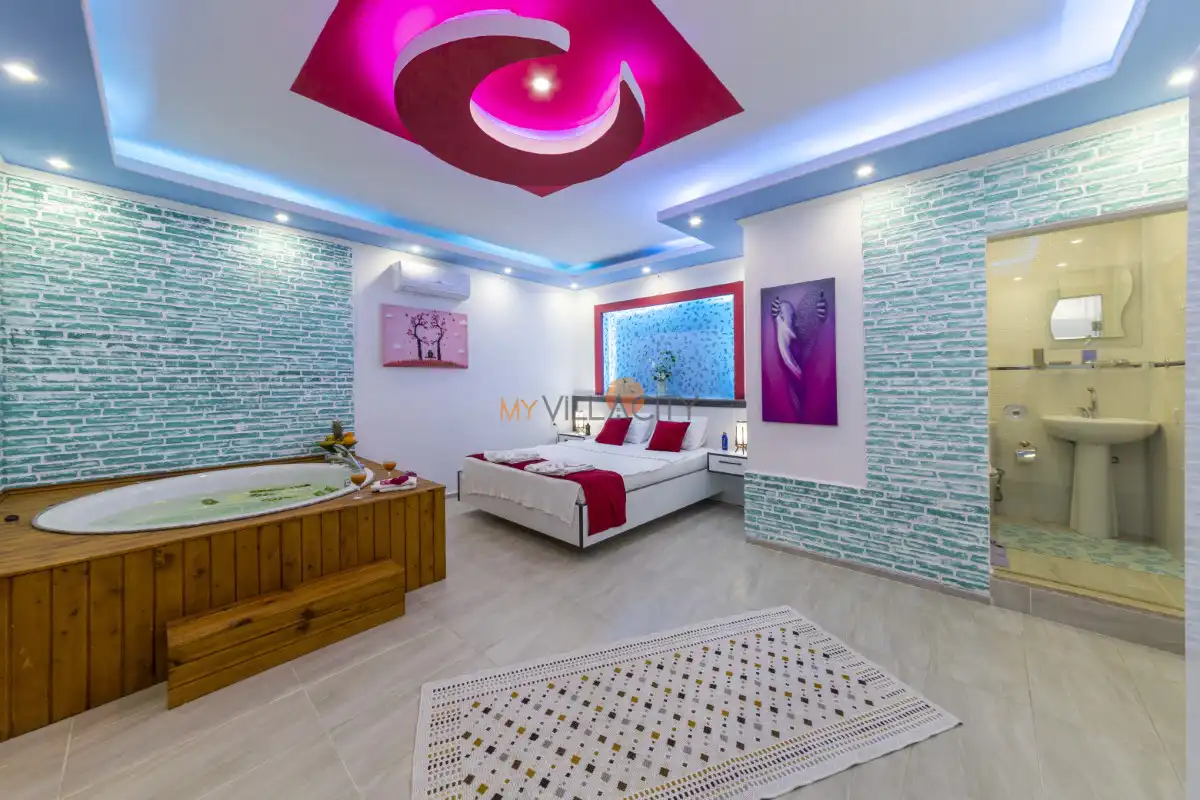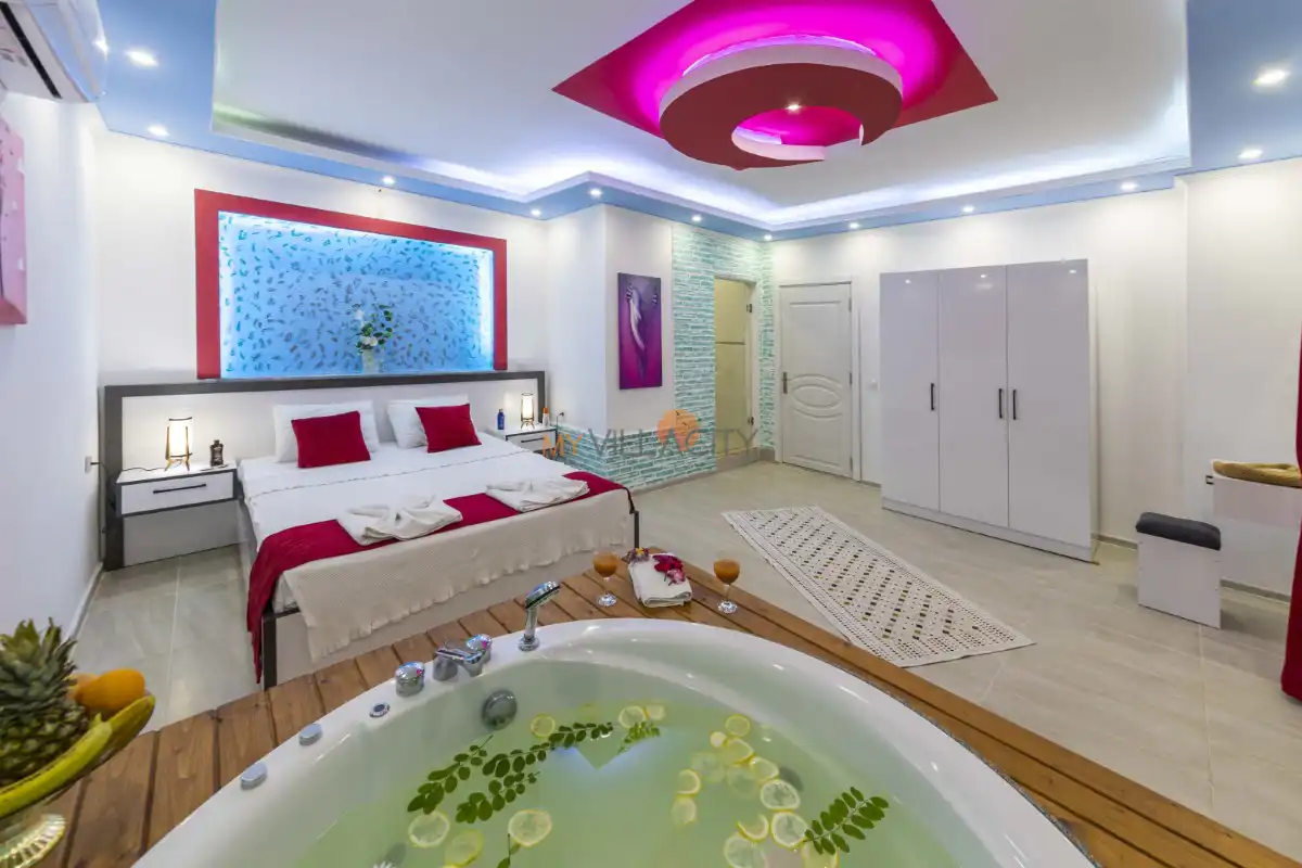 - 1 Çift Kişilik Yatak, 1 Jakuzi, 1 Banyo/WC, 2 Komodin, Elbise dolabı, Makyaj Masası, Klima,
