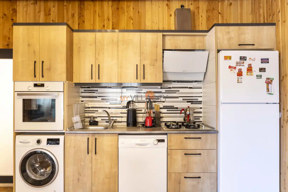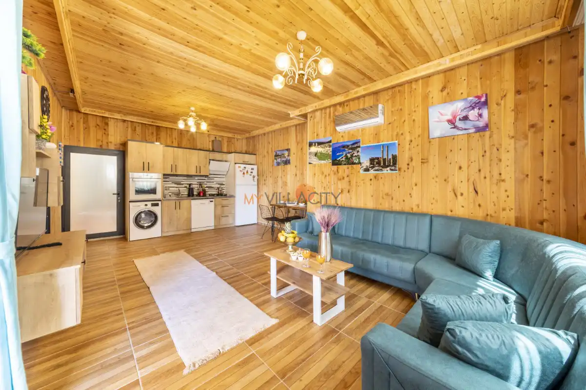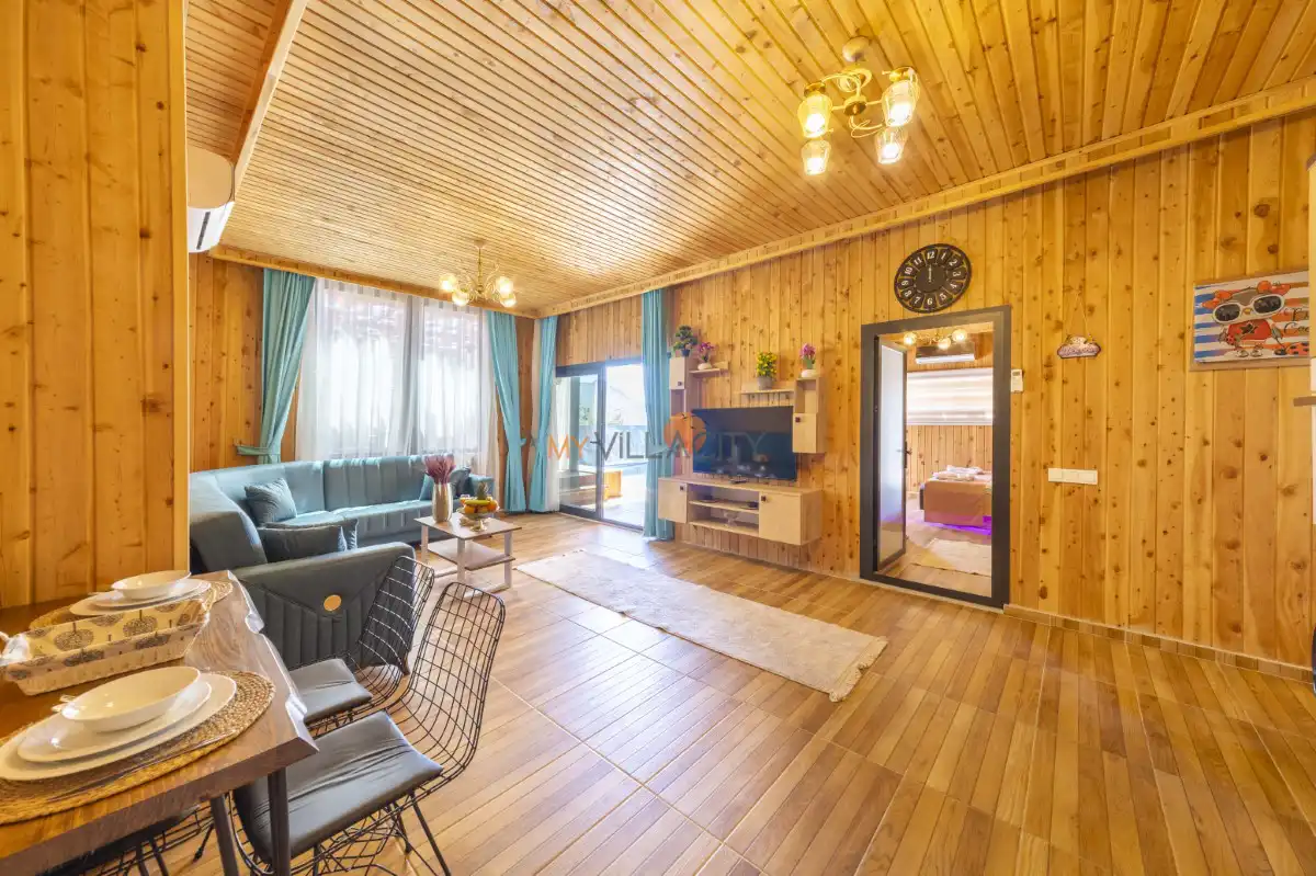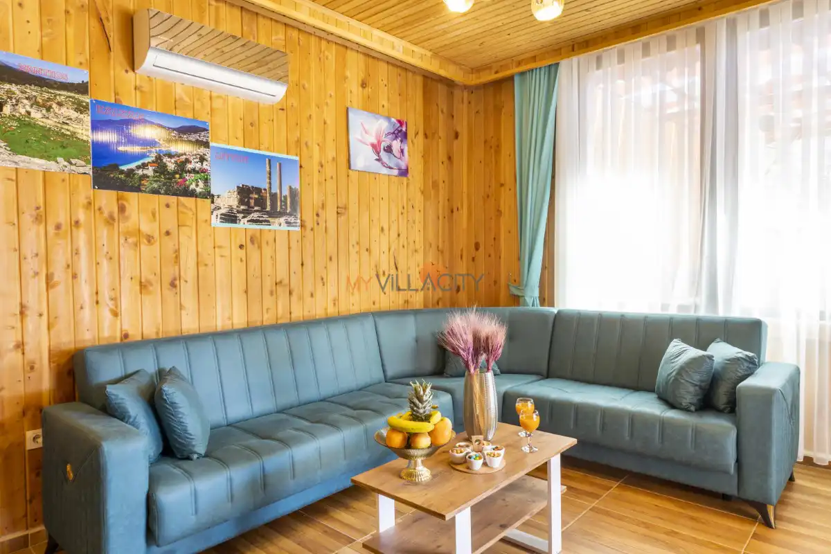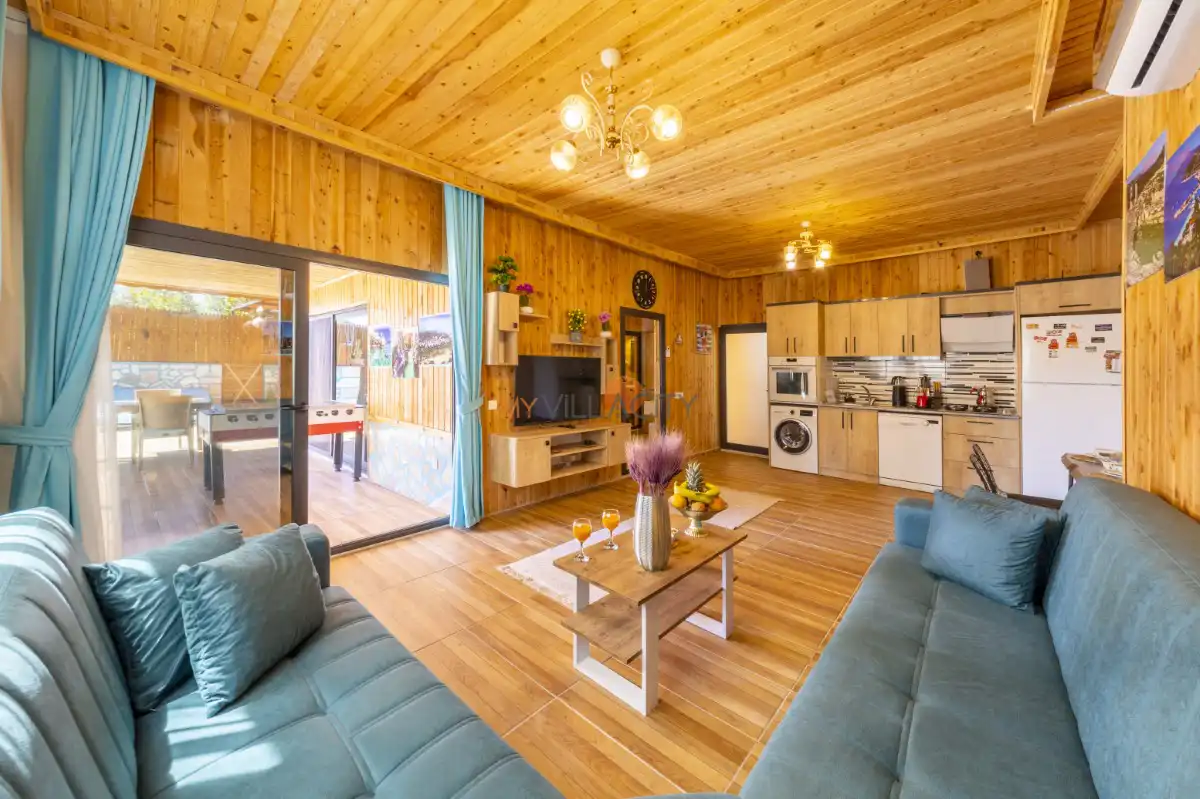 Modern ve konforlu şekilde dekore edilen villanın salonunda rahat bir oturma grubu, televizyon, klima ve havuz terasına direkt çıkış bulunur. Tam donanımlı mutfağı sayesinde tatiliniz boyunca ihtiyaç duyabileceğiniz tüm ekipmanlara kolaylıkla ulaşabilir, keyifli sofralar hazırlayabilirsiniz.