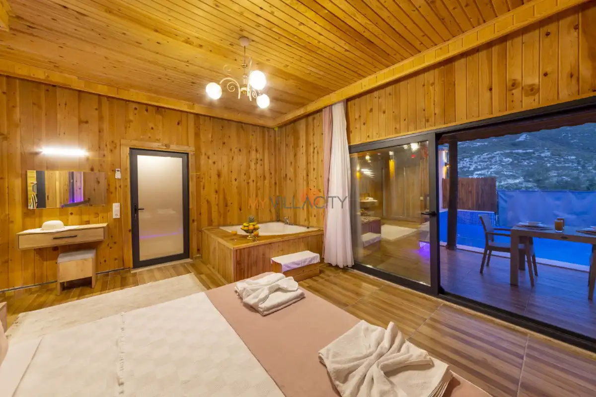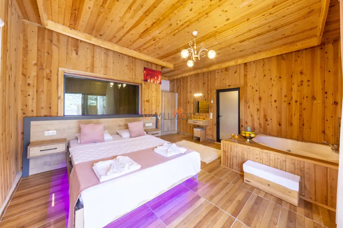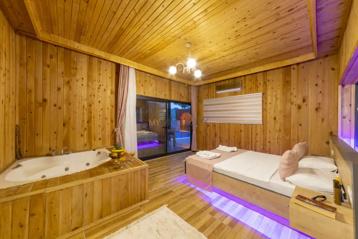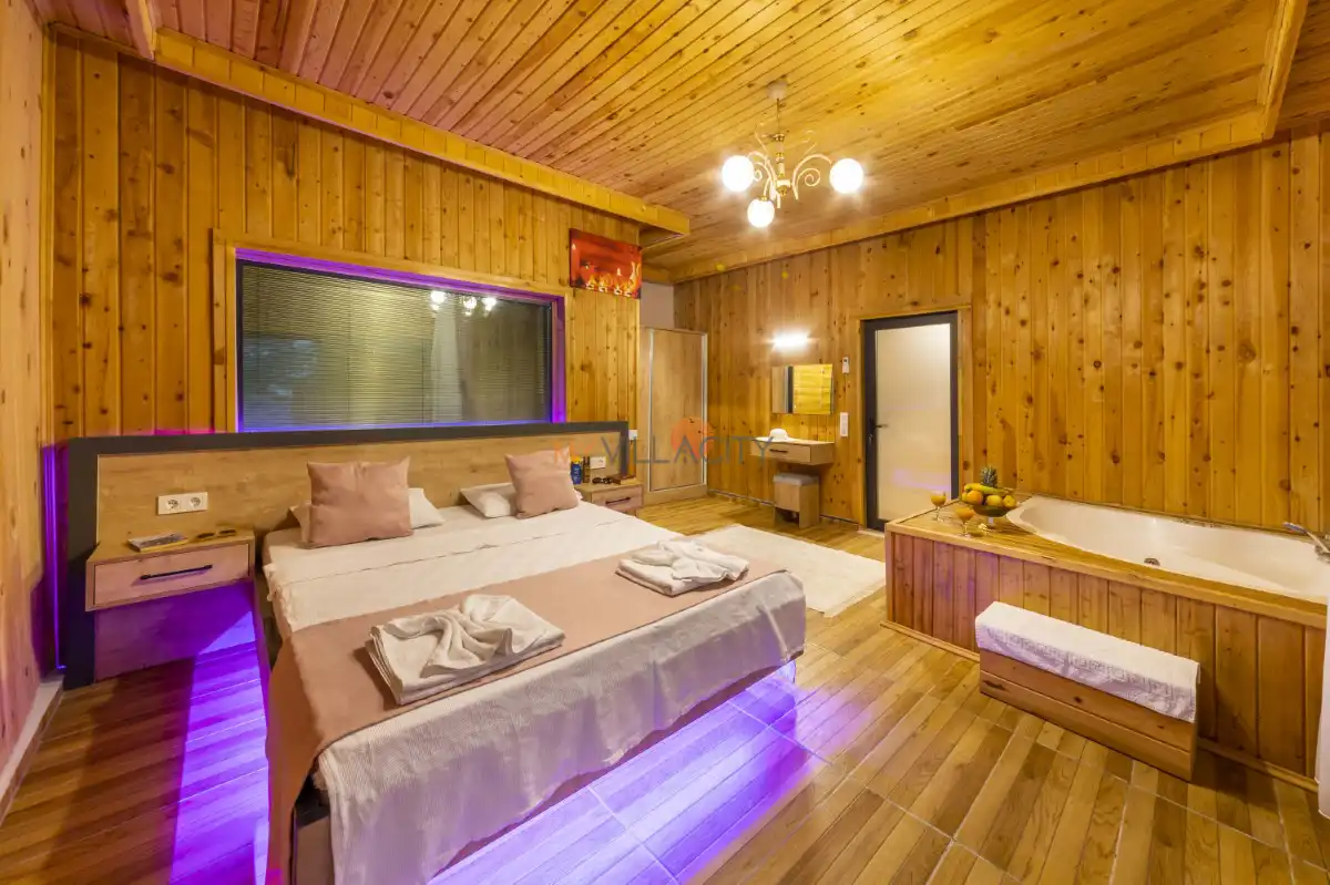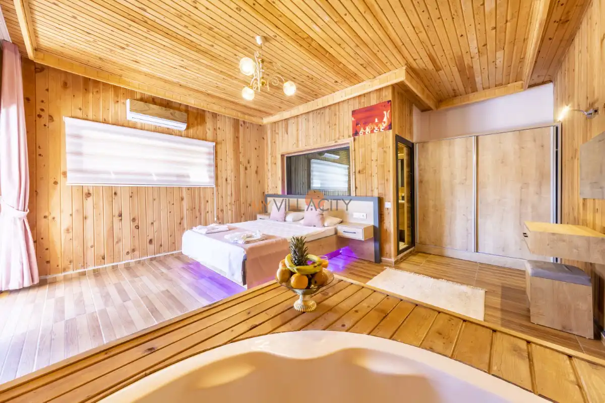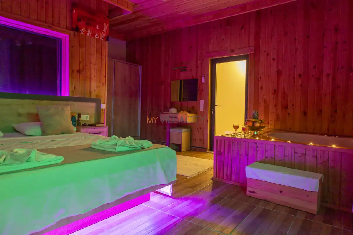 Villanın yatak odasında ise çift kişilik yatak, klima, televizyon, özel banyo ve tuvaletin yanı sıra romantik anlarınıza eşlik edecek 2 kişilik jakuzi yer almaktadır. Günün yorgunluğunu atabileceğiniz bu alan, balayı çiftleri için unutulmaz bir konfor sunar.