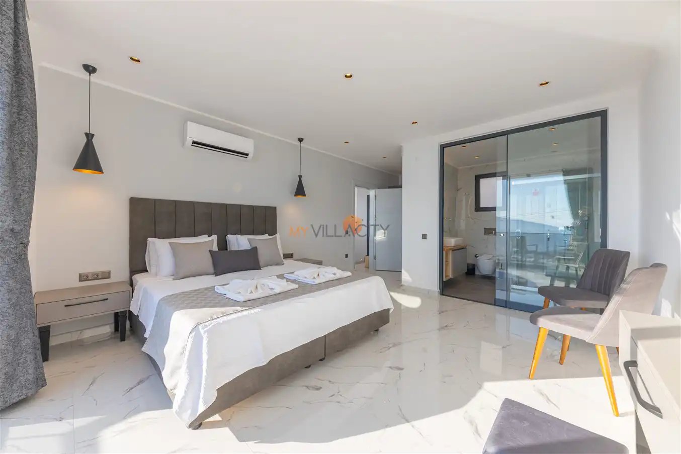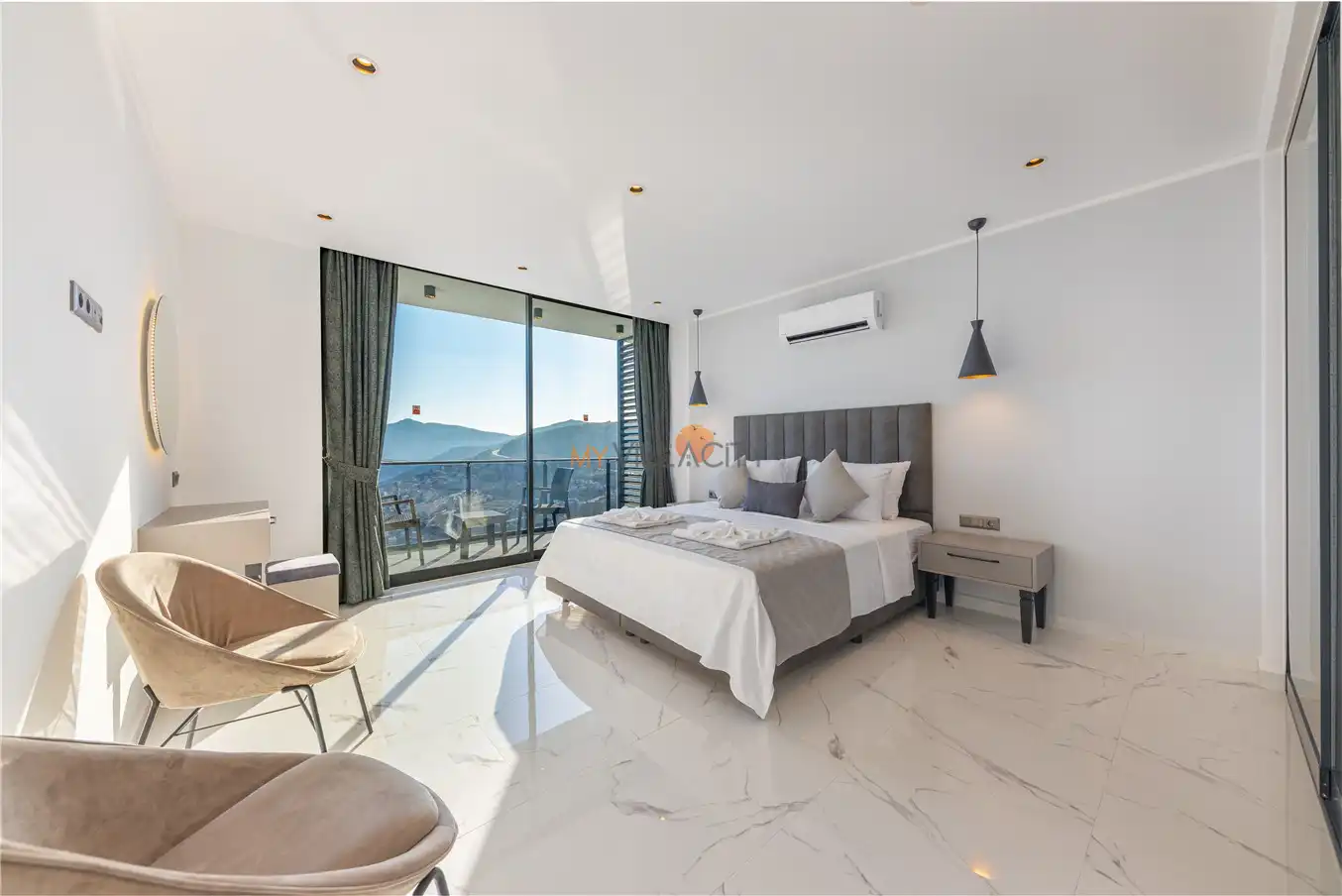 - 1 Çift Kişilik Yatak, 1 Banyo/WC, 2 Komodin, Elbise dolabı, Makyaj Masası, Klima,