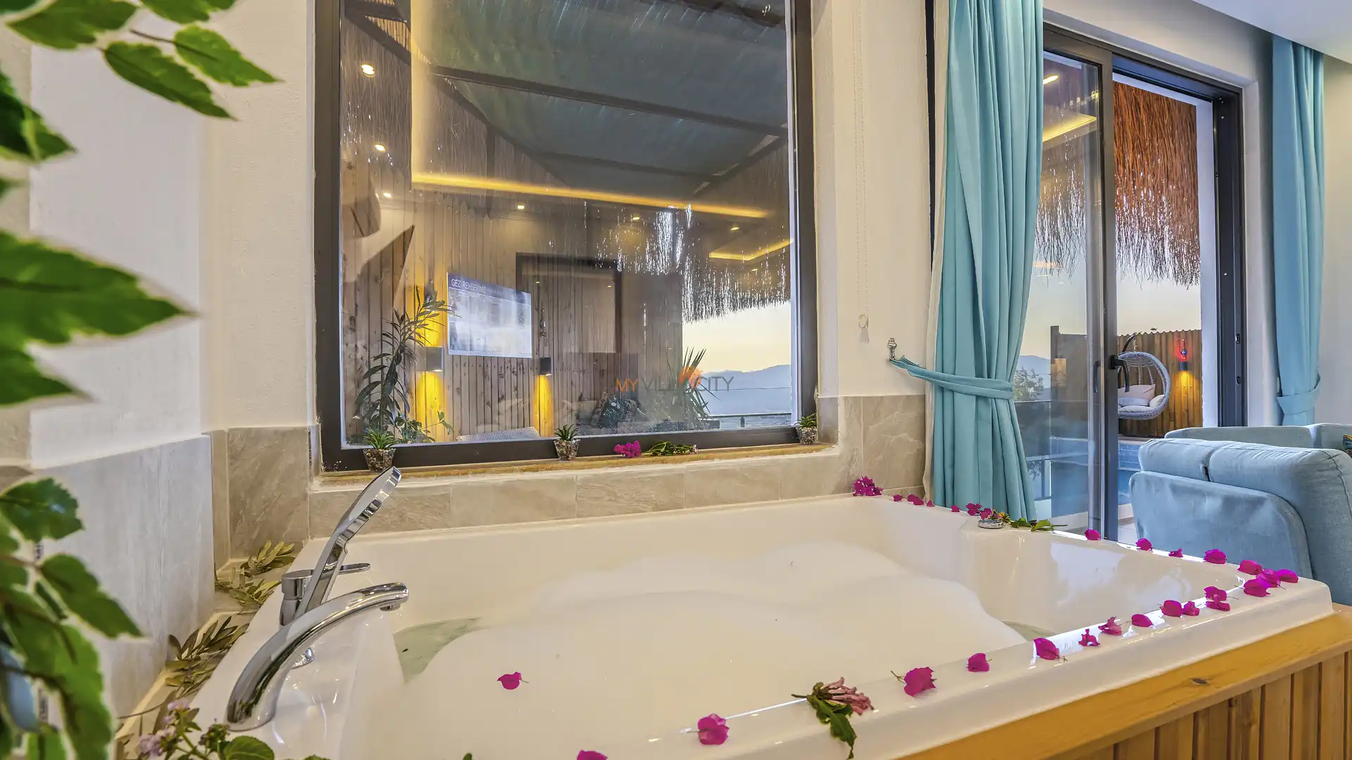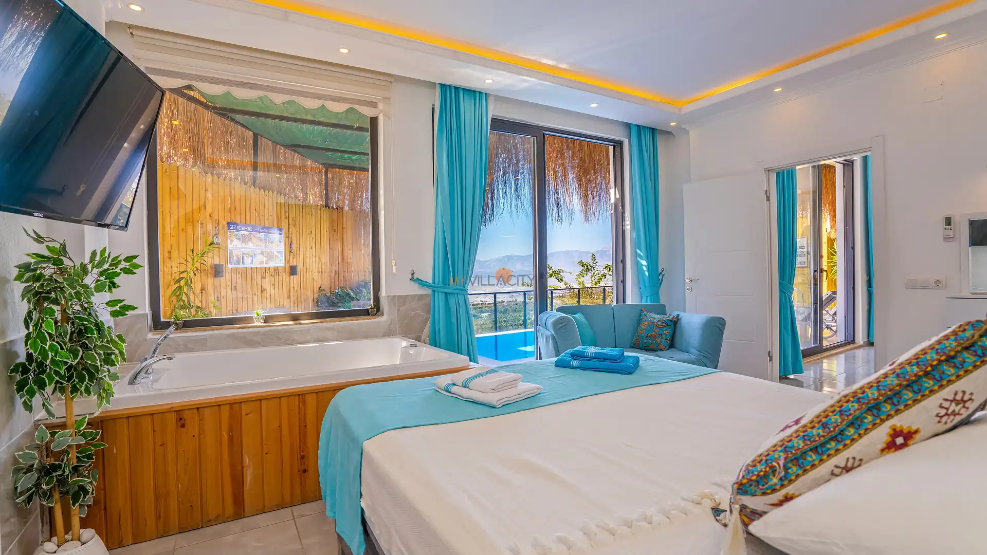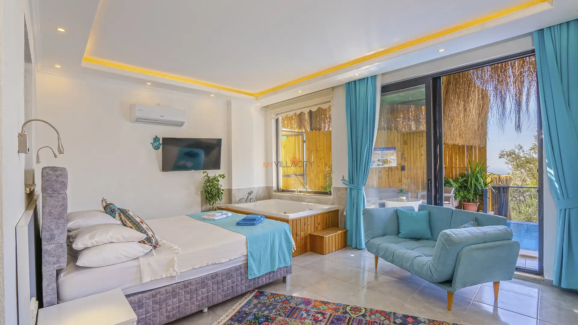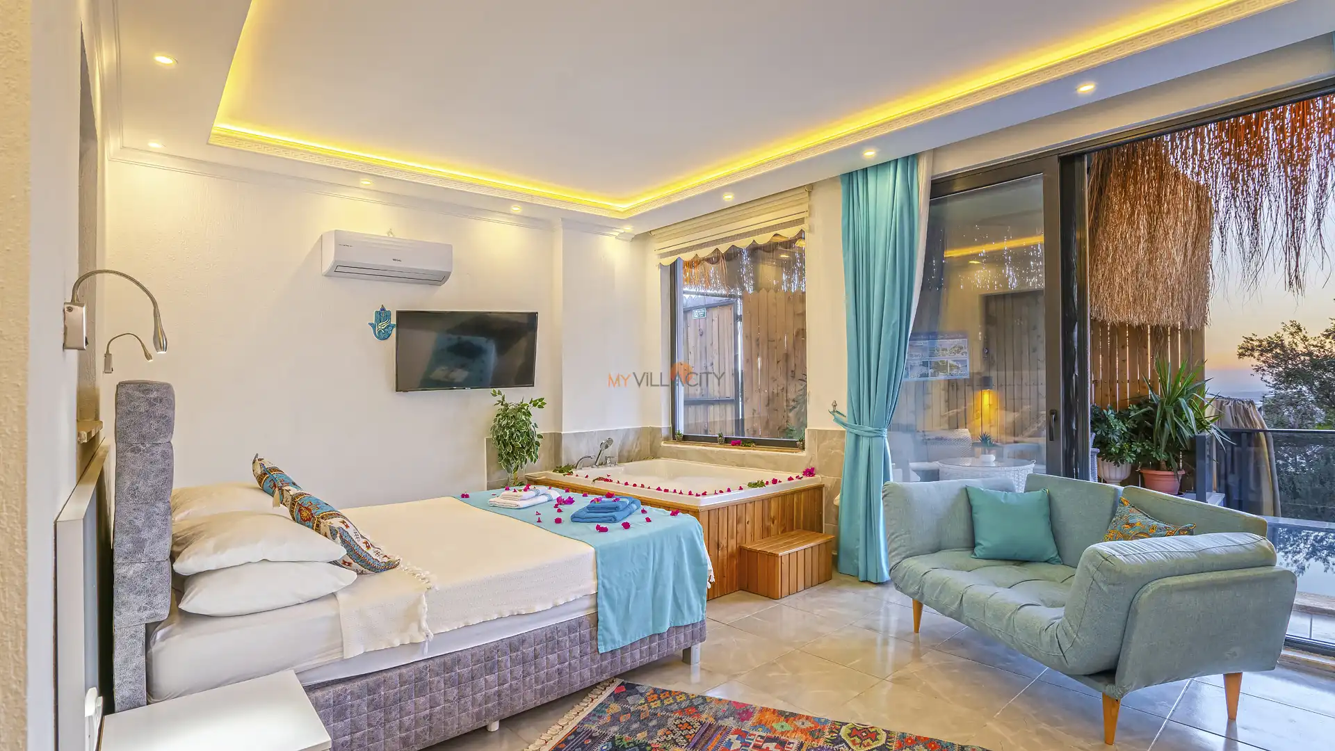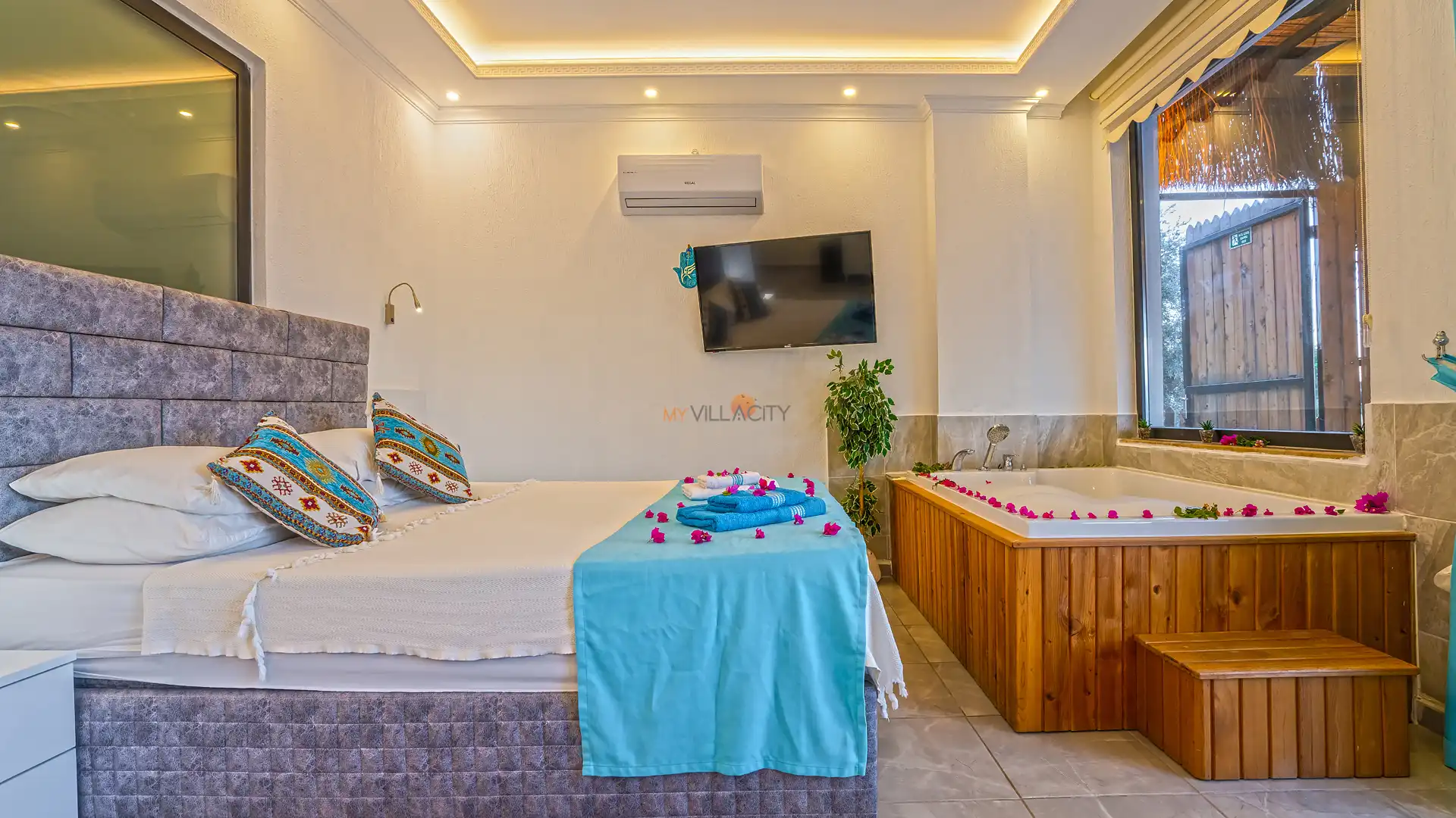 - 1 Çift Kişilik Yatak, 1 Jakuzi, 1 Banyo/WC, 2 Komodin, Elbise dolabı, Makyaj Masası, Klima,