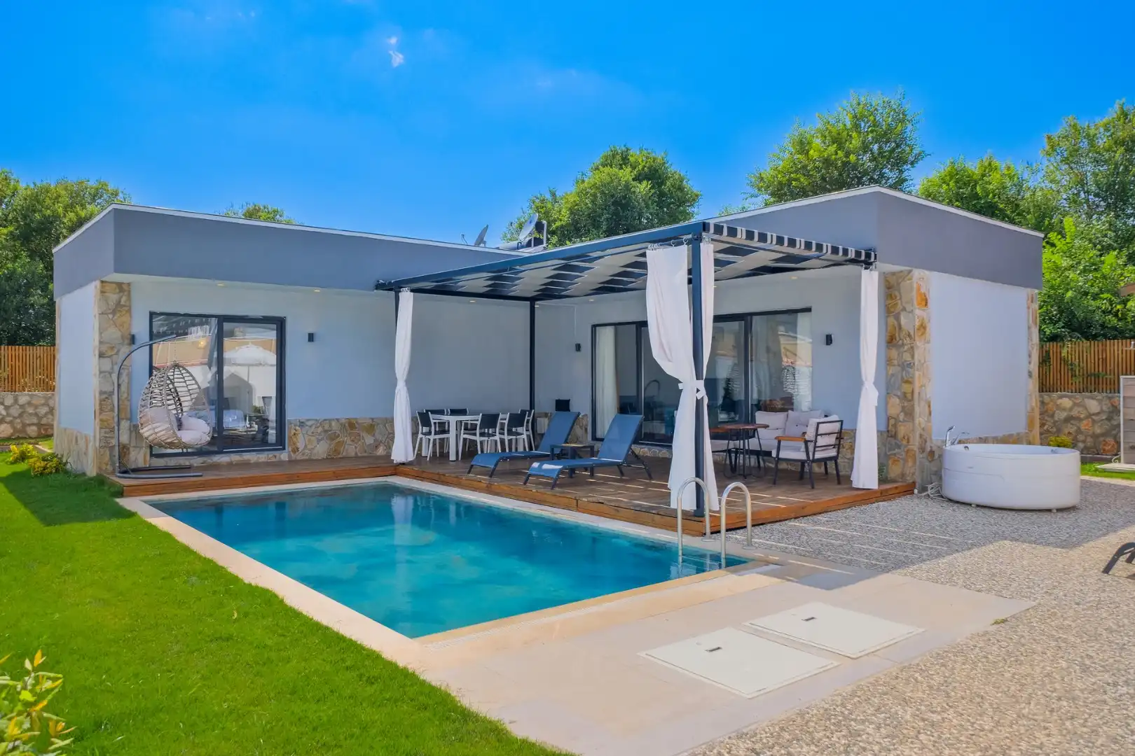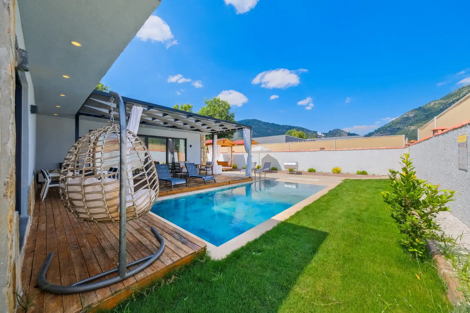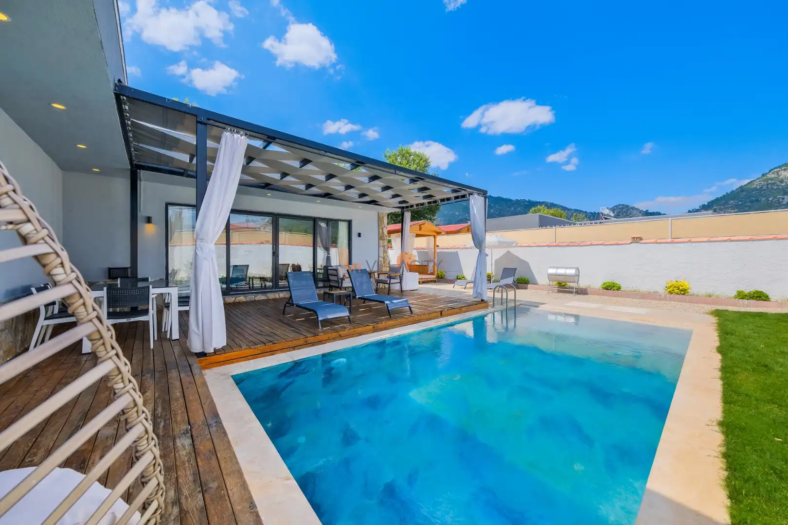 Villa Shiraz Üzümlü, Muğla Fethiye Bölgesinde yer alan muhteşem bir tatil villasıdır. Bu villa, 2 yatak odası ve 4 kişilik kapasiteye sahiptir. Özellikle muhafazakar aileler ve balayı çiftlerimiz için ideal bir seçenektir. Havuz alanı tamamen korunaklıdır ve misafirlerin mahremiyetine önem verilmektedir. Yatak odasında özel banyo ve tuvalet bulunmaktadır.. Villamızın lüks ve konforlu tasarımı göz kamaştırmaktadır. Havuz terasımız oldukça geniştir ve bu alanda keyifli vakit geçirebilirsiniz.Modern mobilyaları,şık dekarasyonu,modern ile ön plana çıkmaktadır. İhtiyaç duyabileceğiniz tüm temel araç ve gereçler villada mevcuttur. Doğayla iç içe, sakin ve huzurlu bir tatil isteyen misafirlerimiz için mükemmel bir seçimdir.Unutulmaz bir tatil içim Villa Shiraz Üzümlü ,tam da bunun için var.