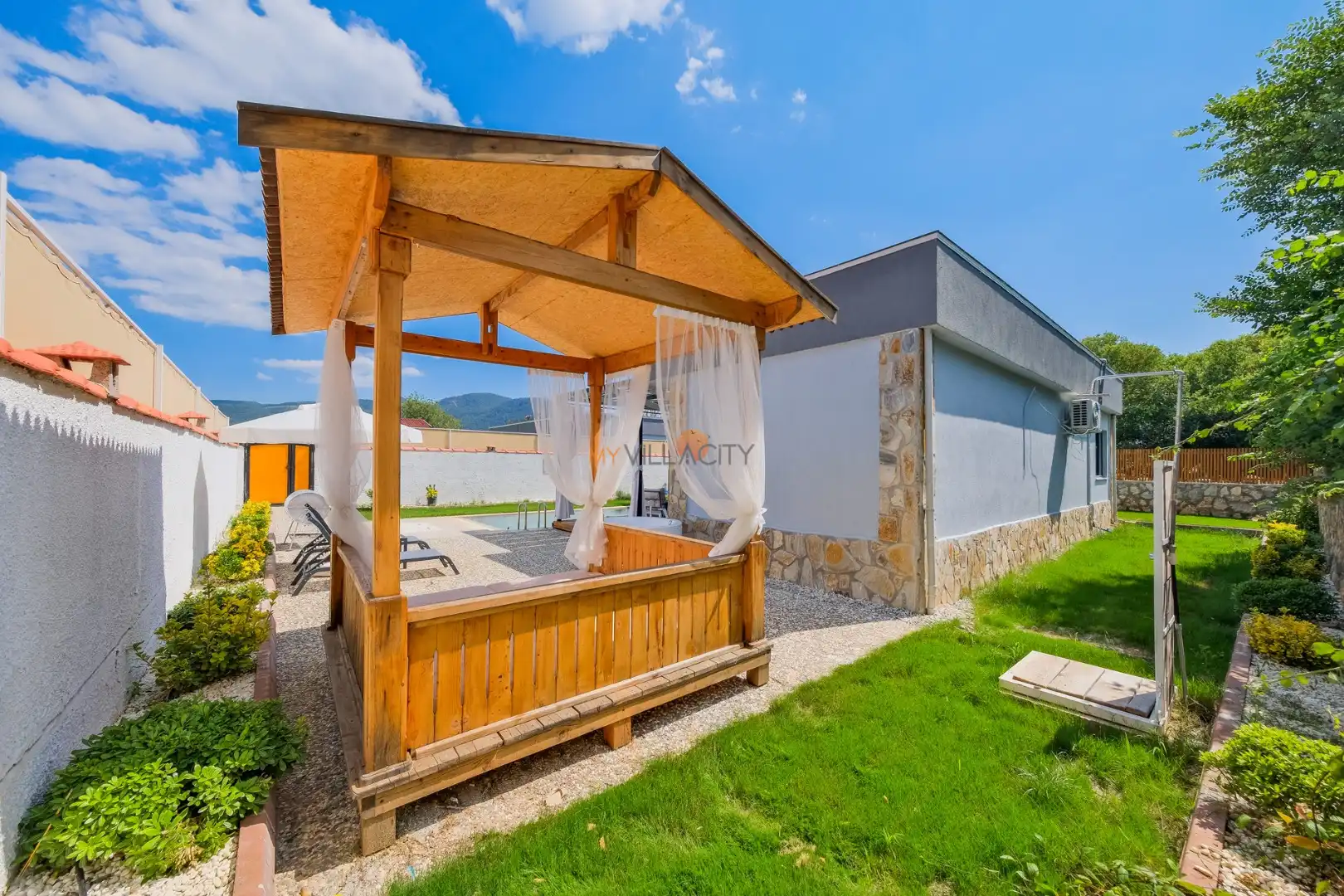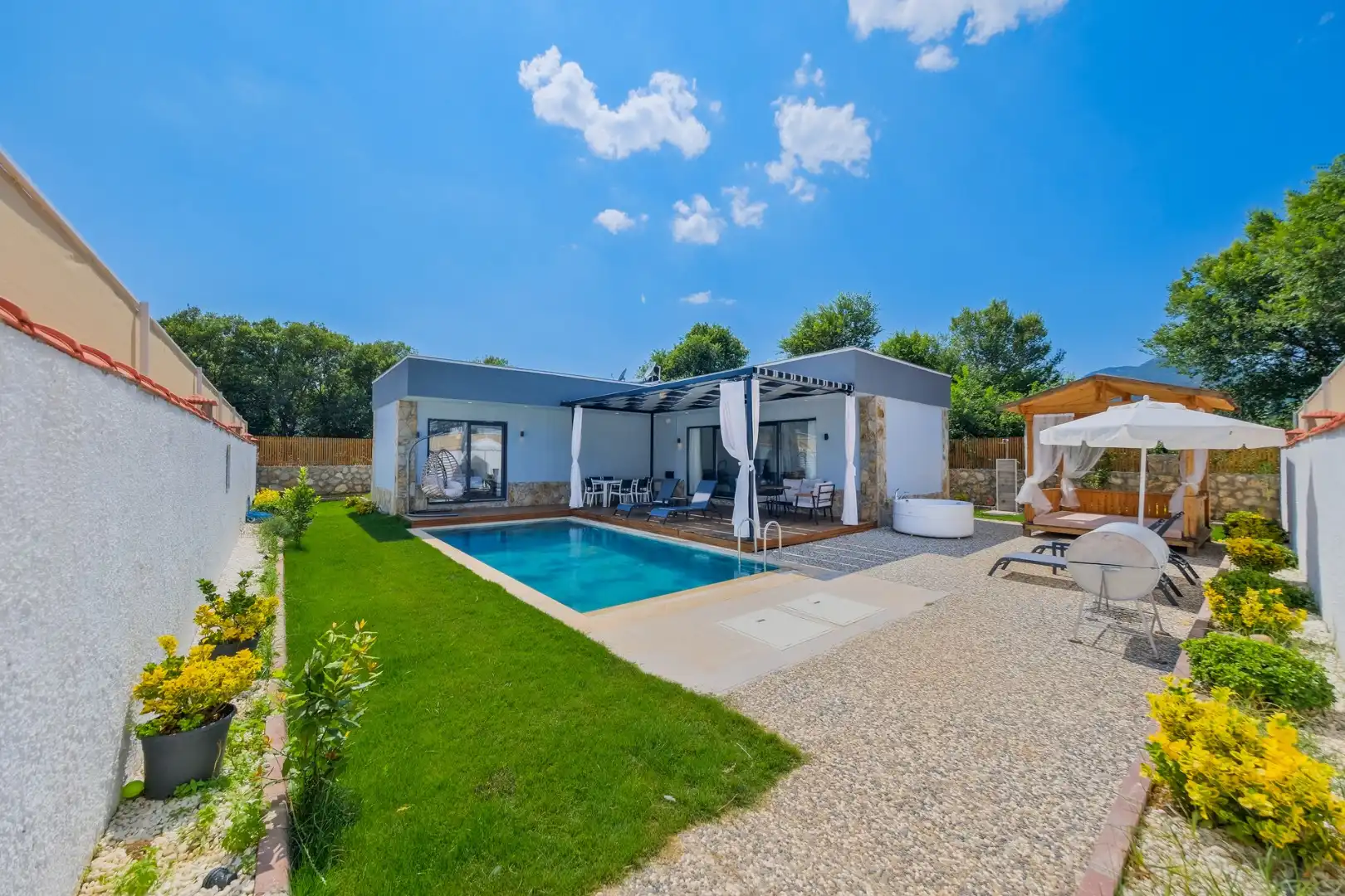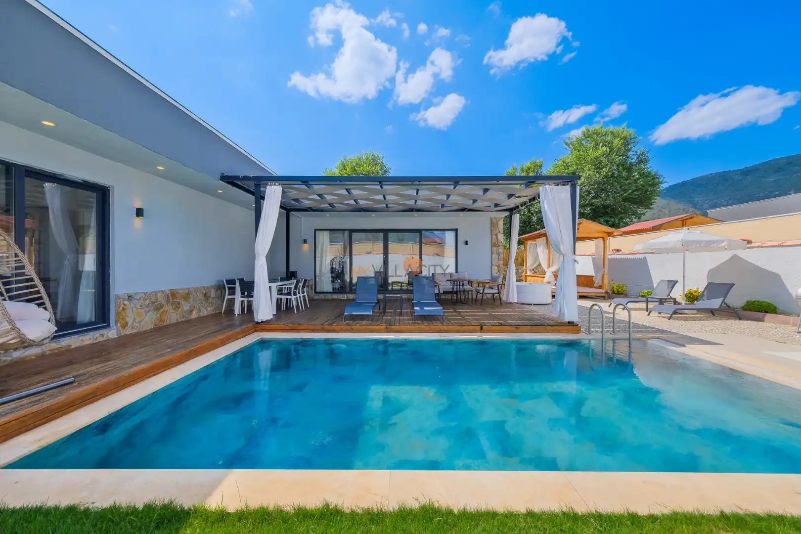 Villa Shiraz Üzümlü, Muğla Fethiye Bölgesinde yer alan muhteşem bir tatil villasıdır. Bu villa, 2 yatak odası ve 4 kişilik kapasiteye sahiptir. Özellikle muhafazakar aileler ve balayı çiftlerimiz için ideal bir seçenektir. Havuz alanı tamamen korunaklıdır ve misafirlerin mahremiyetine önem verilmektedir. Yatak odasında özel banyo ve tuvalet bulunmaktadır.. Villamızın lüks ve konforlu tasarımı göz kamaştırmaktadır. Havuz terasımız oldukça geniştir ve bu alanda keyifli vakit geçirebilirsiniz.Modern mobilyaları,şık dekarasyonu,modern ile ön plana çıkmaktadır. İhtiyaç duyabileceğiniz tüm temel araç ve gereçler villada mevcuttur. Doğayla iç içe, sakin ve huzurlu bir tatil isteyen misafirlerimiz için mükemmel bir seçimdir.Unutulmaz bir tatil içim Villa Shiraz Üzümlü ,tam da bunun için var.