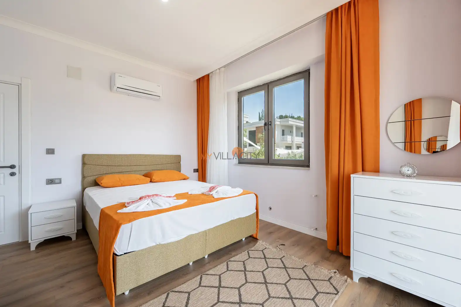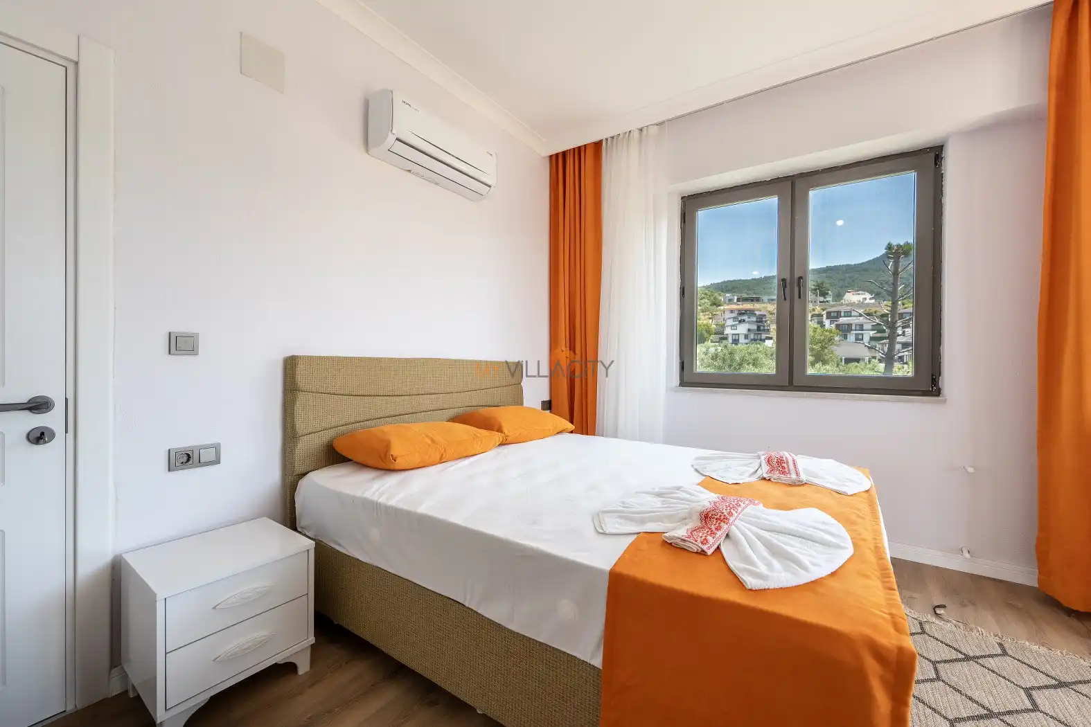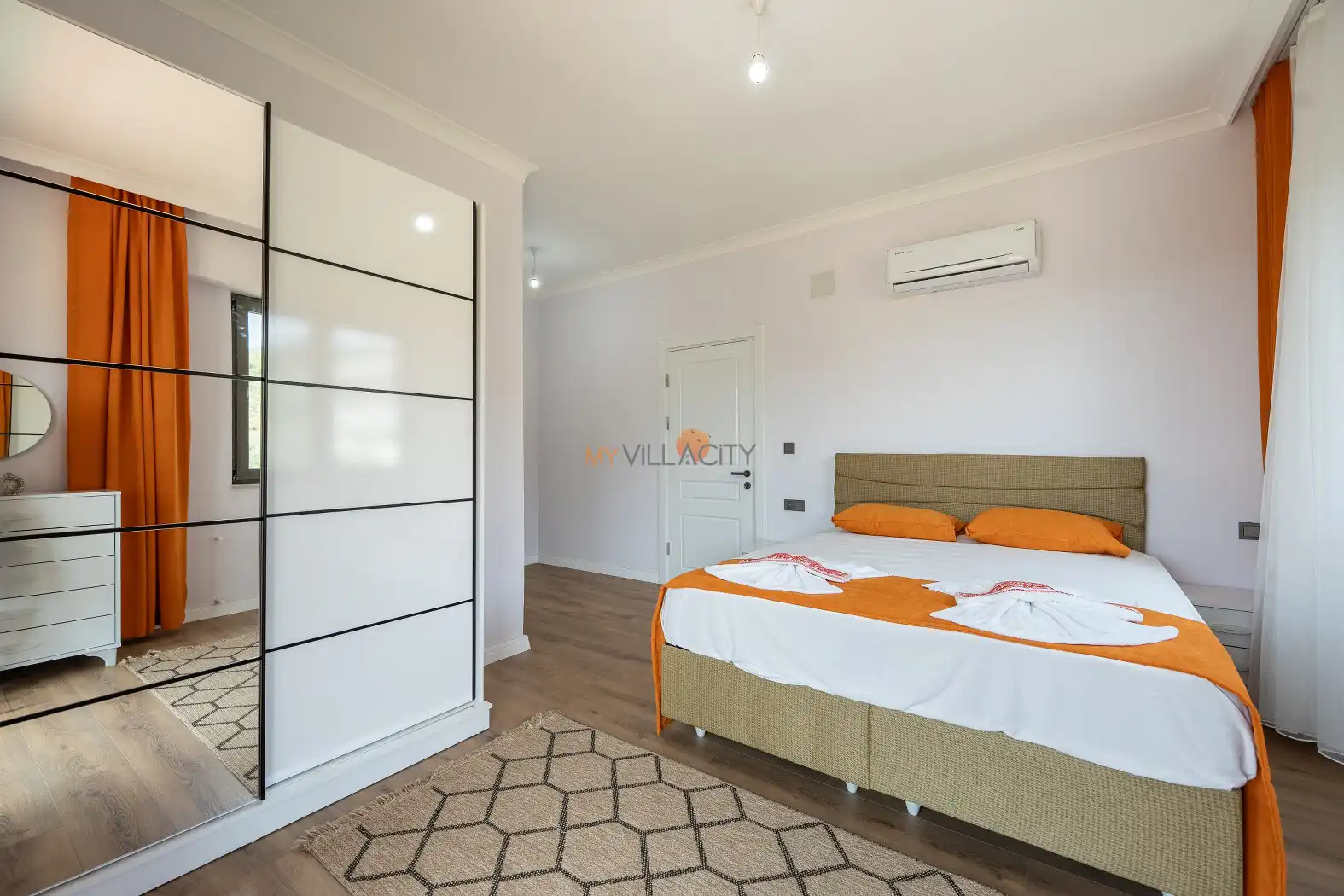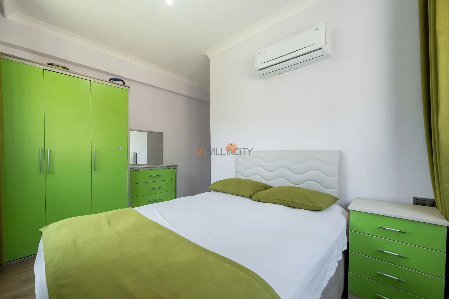 - 1 Çift Kişilik Yatak, 1 Banyo/WC, 2 Komodin, Elbise dolabı, Makyaj Masası, Klima,