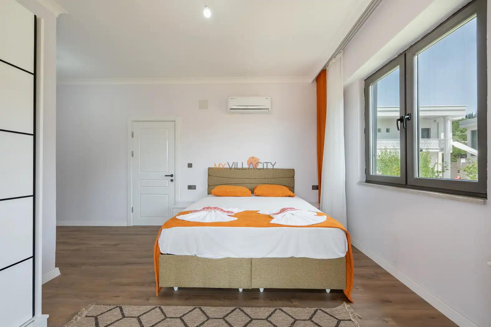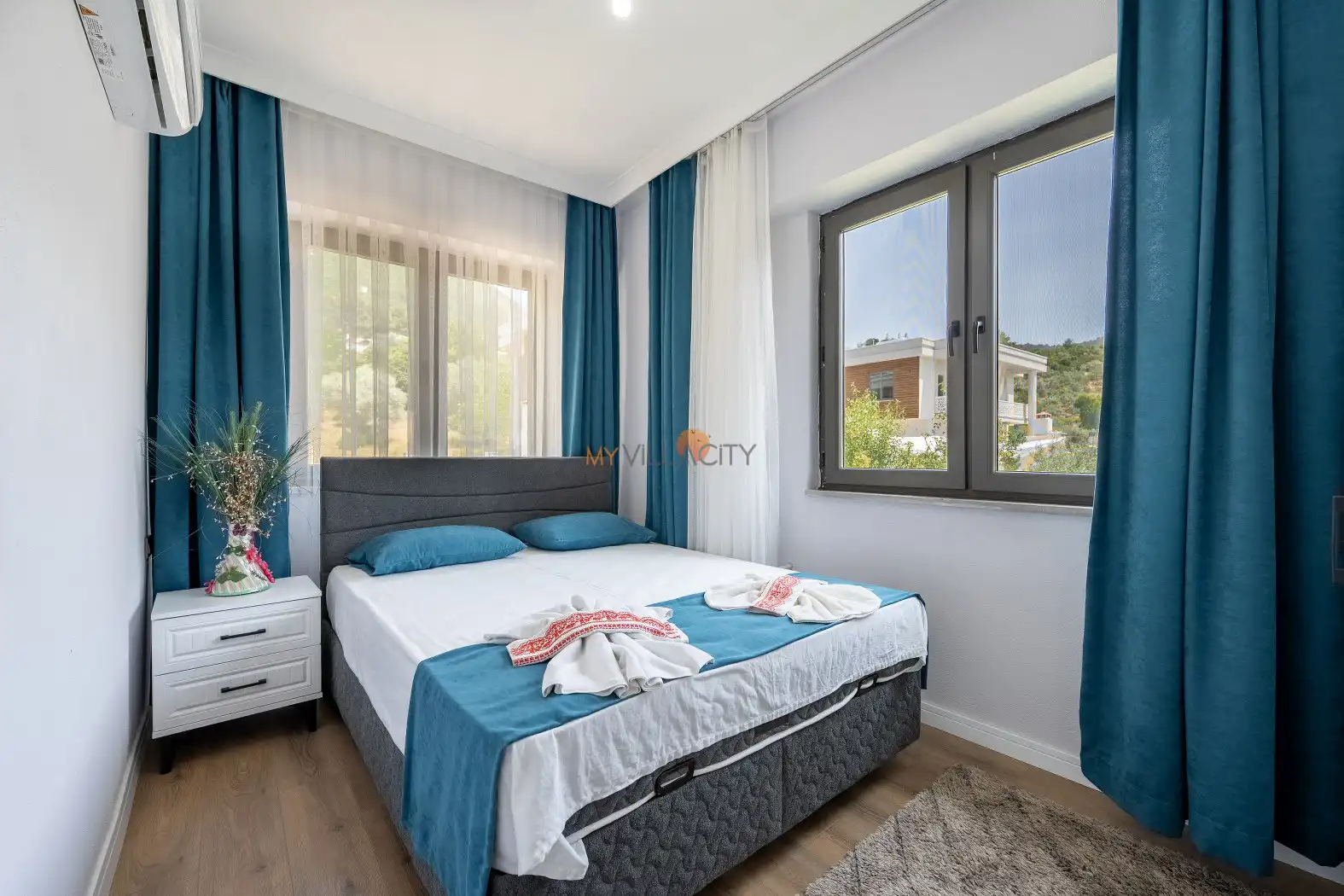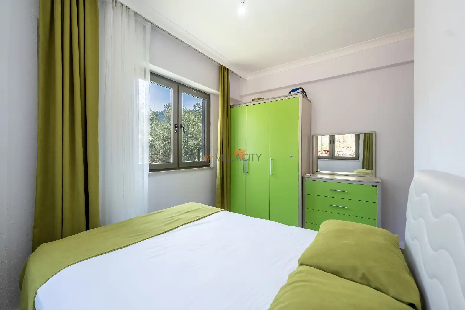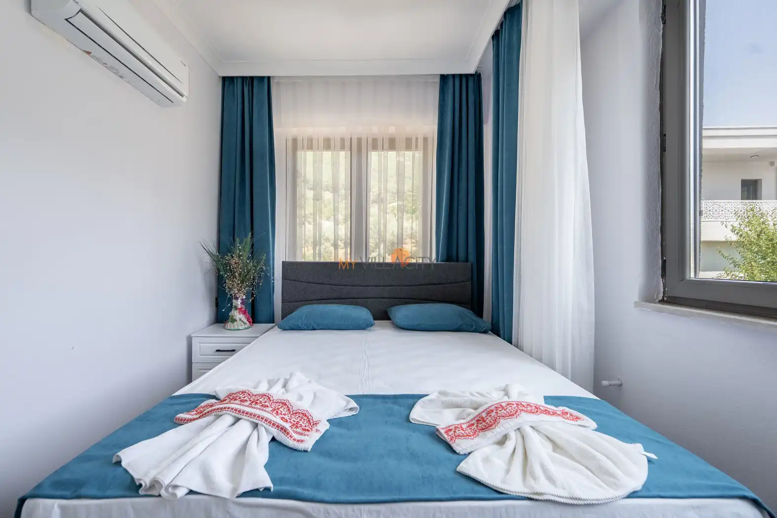 - 1 Çift Kişilik Yatak, 1 Banyo/WC, 2 Komodin, Elbise dolabı, Makyaj Masası, Klima,