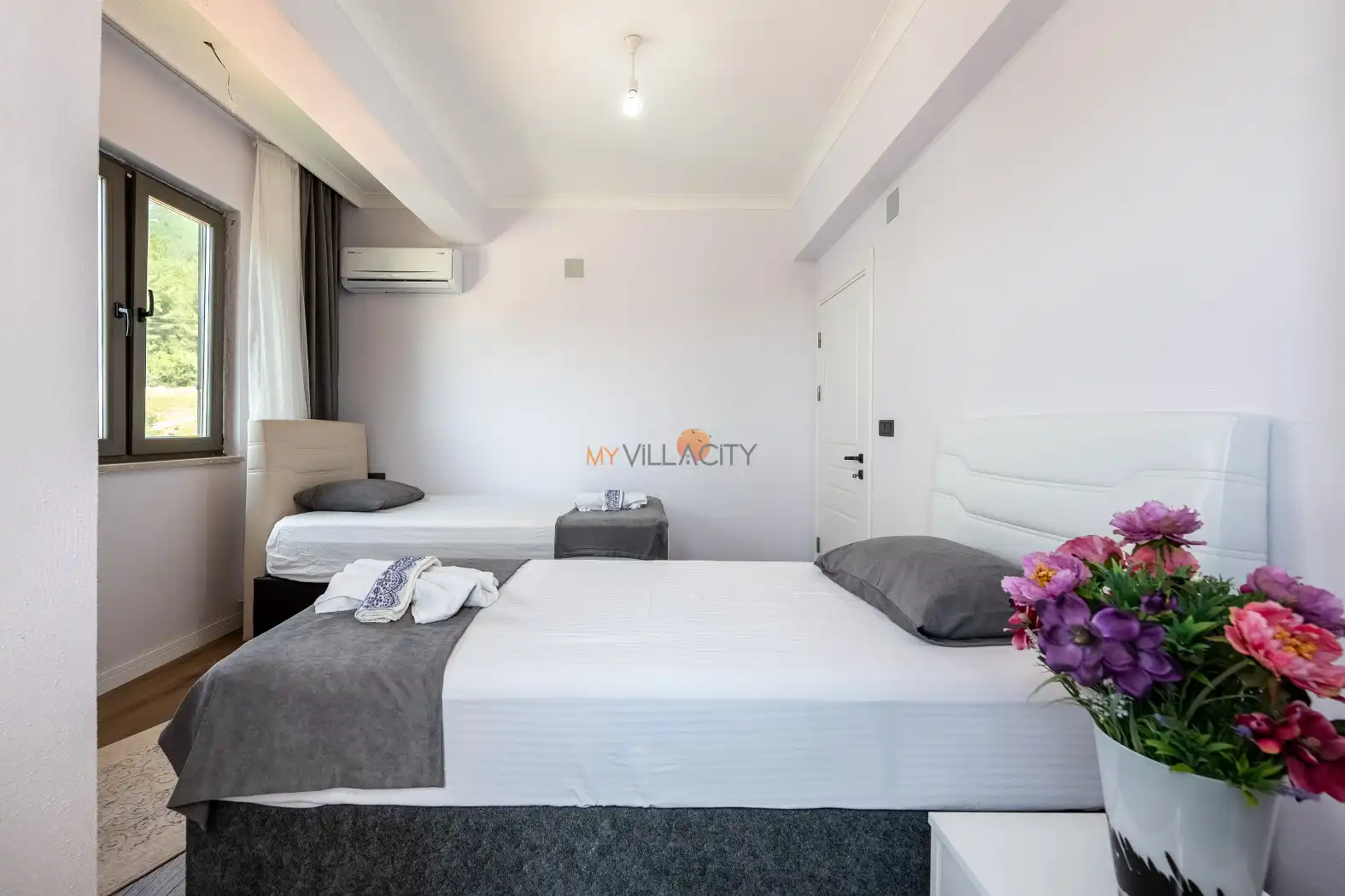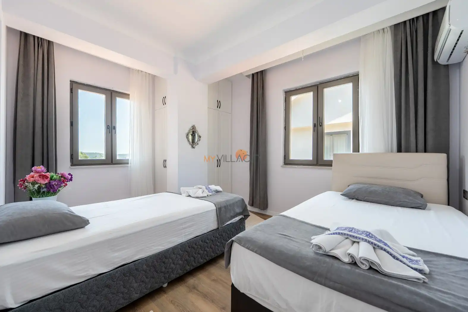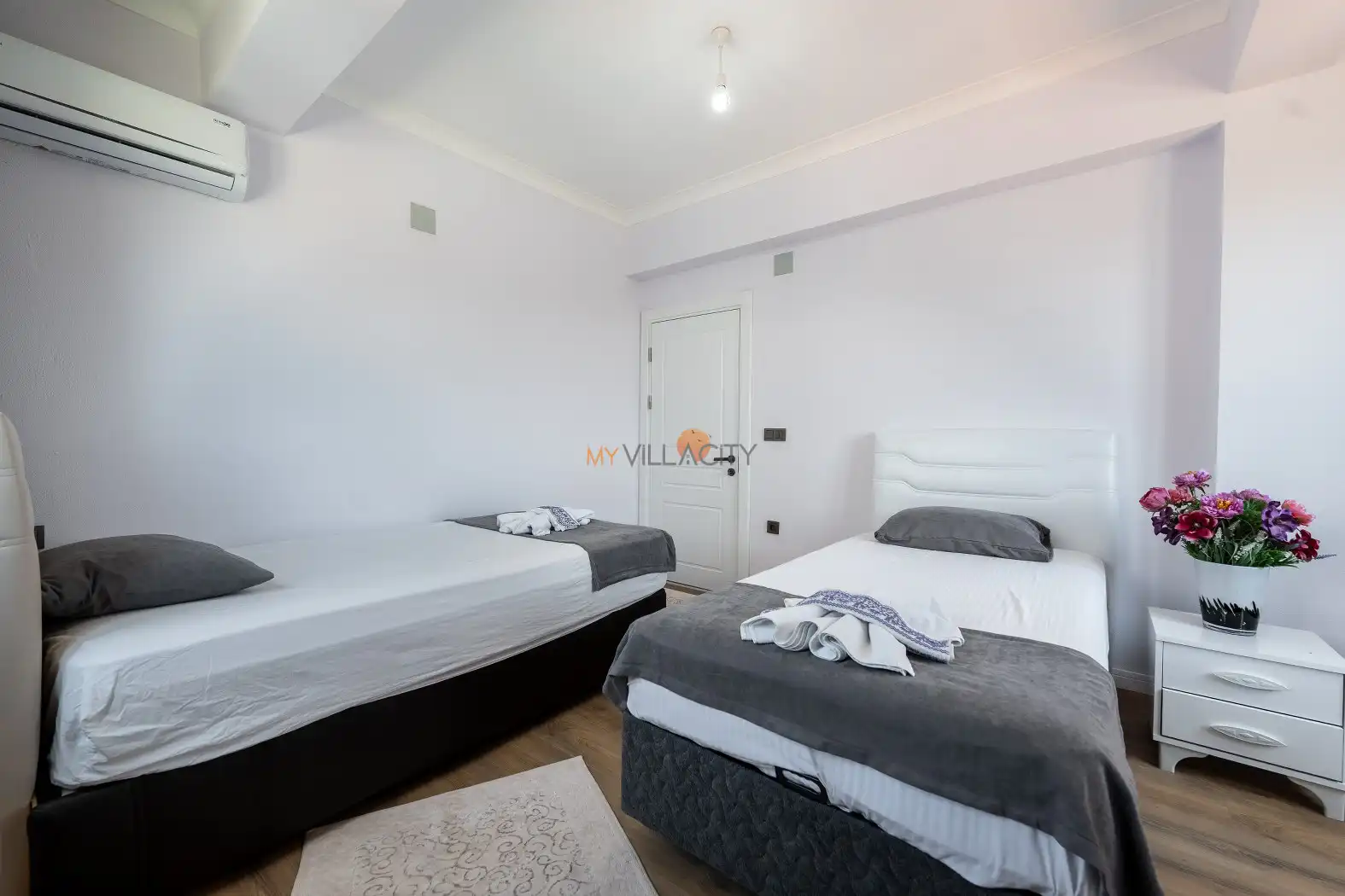 - 2 Tek Kişilik Yatak, 1 Banyo/WC, 2 Komodin, Elbise dolabı, Makyaj Masası, Klima,