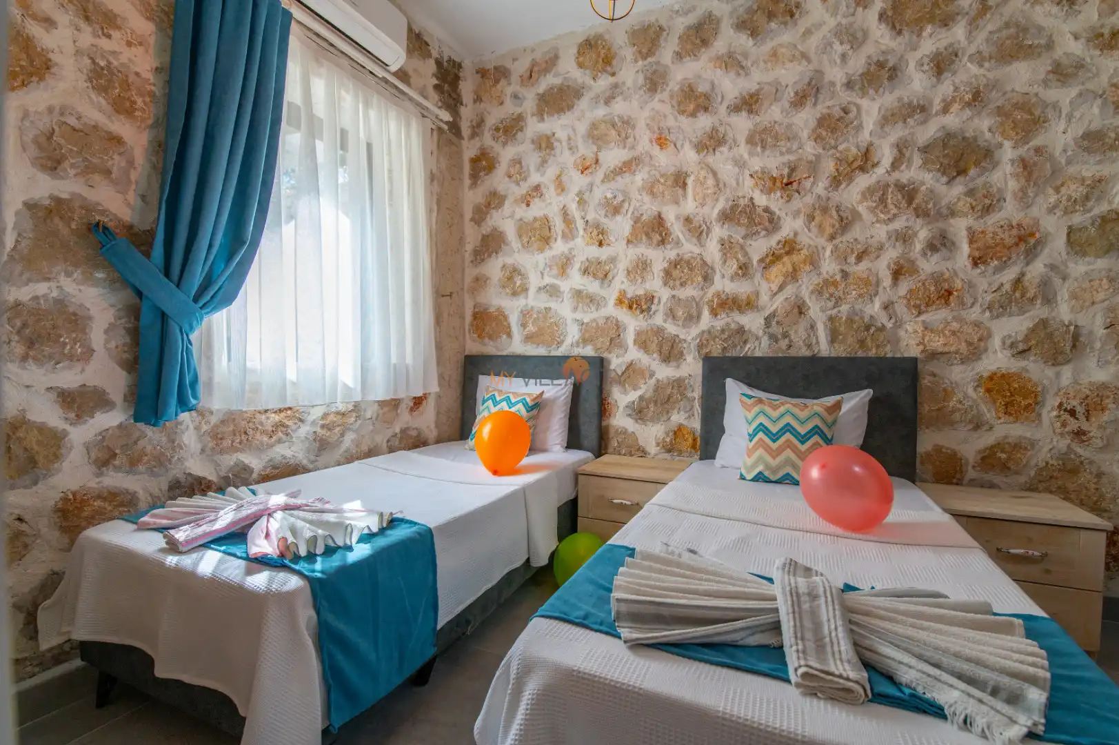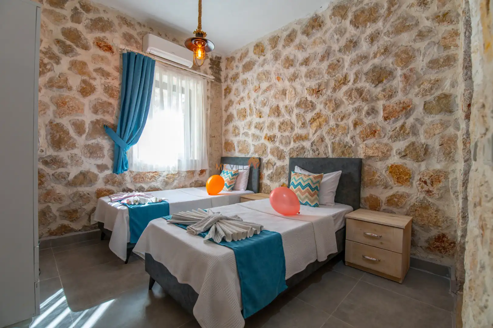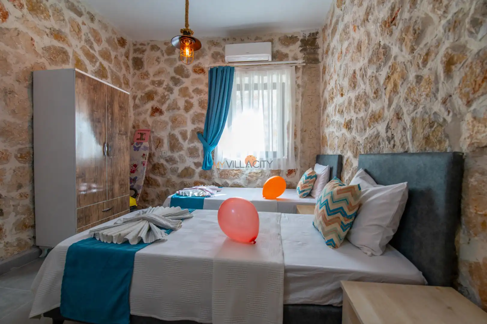 - 2 Tek Kişilik Yatak, 1 Banyo/WC, 2 Komodin, Elbise dolabı, Makyaj Masası, Klima,