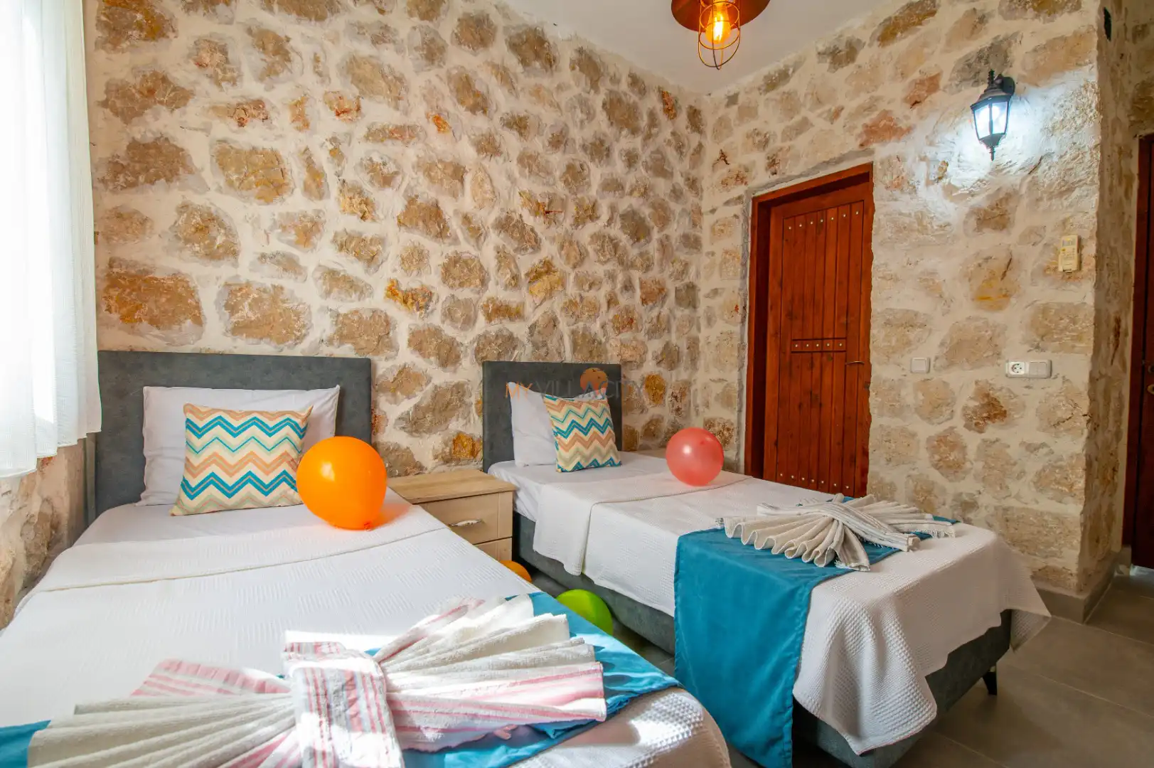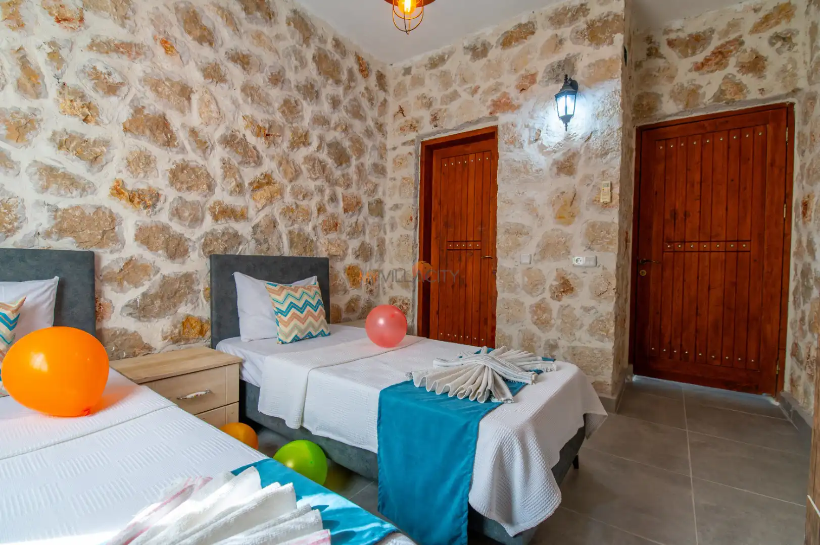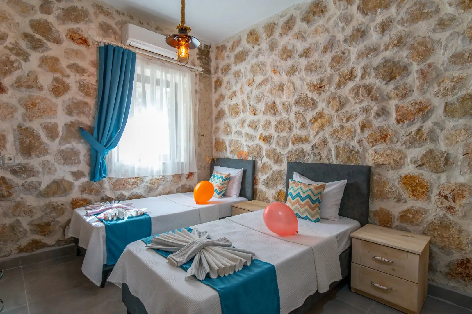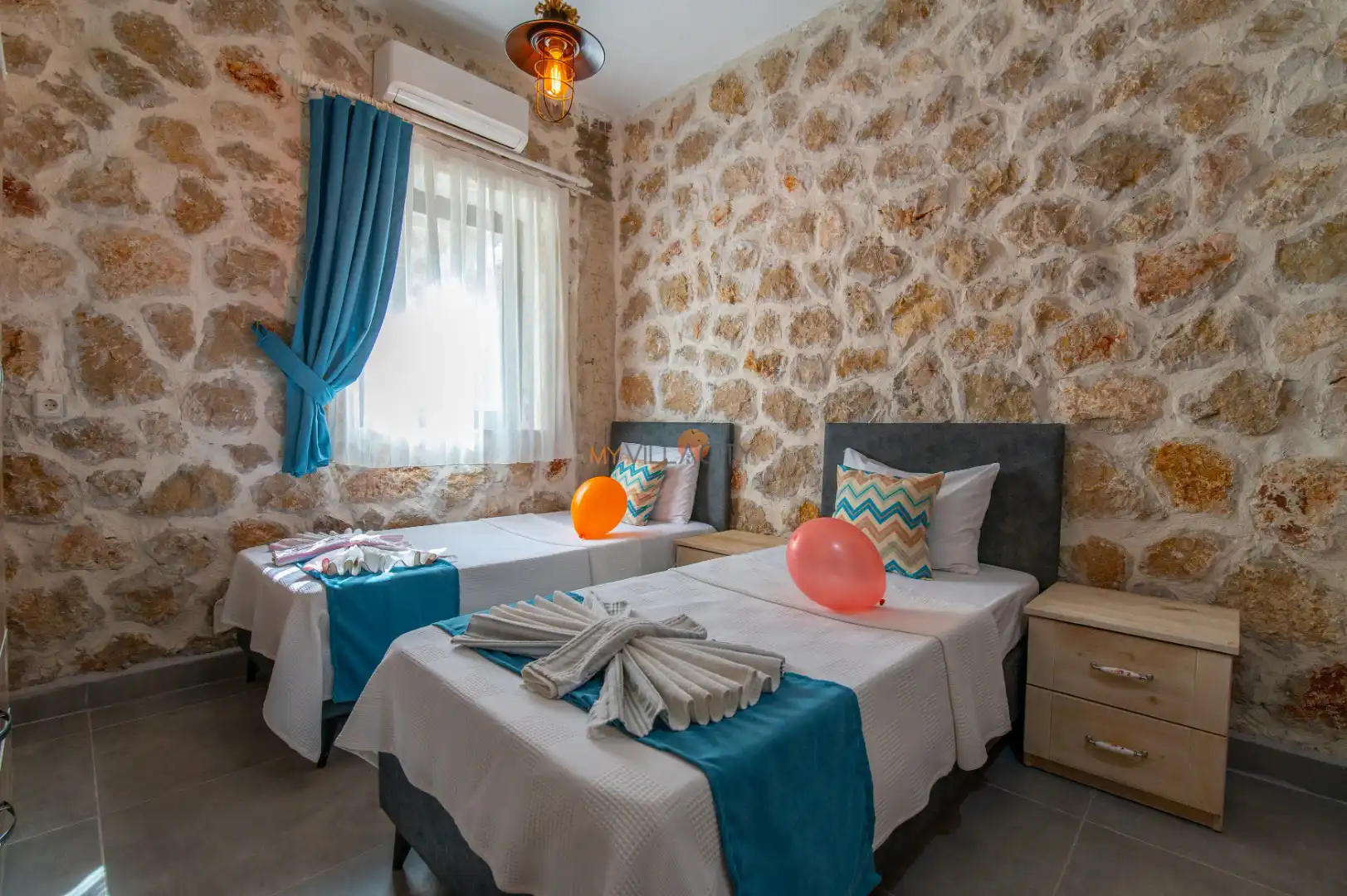 - 2 Tek Kişilik Yatak, 1 Banyo/WC, 2 Komodin, Elbise dolabı, Makyaj Masası, Klima,