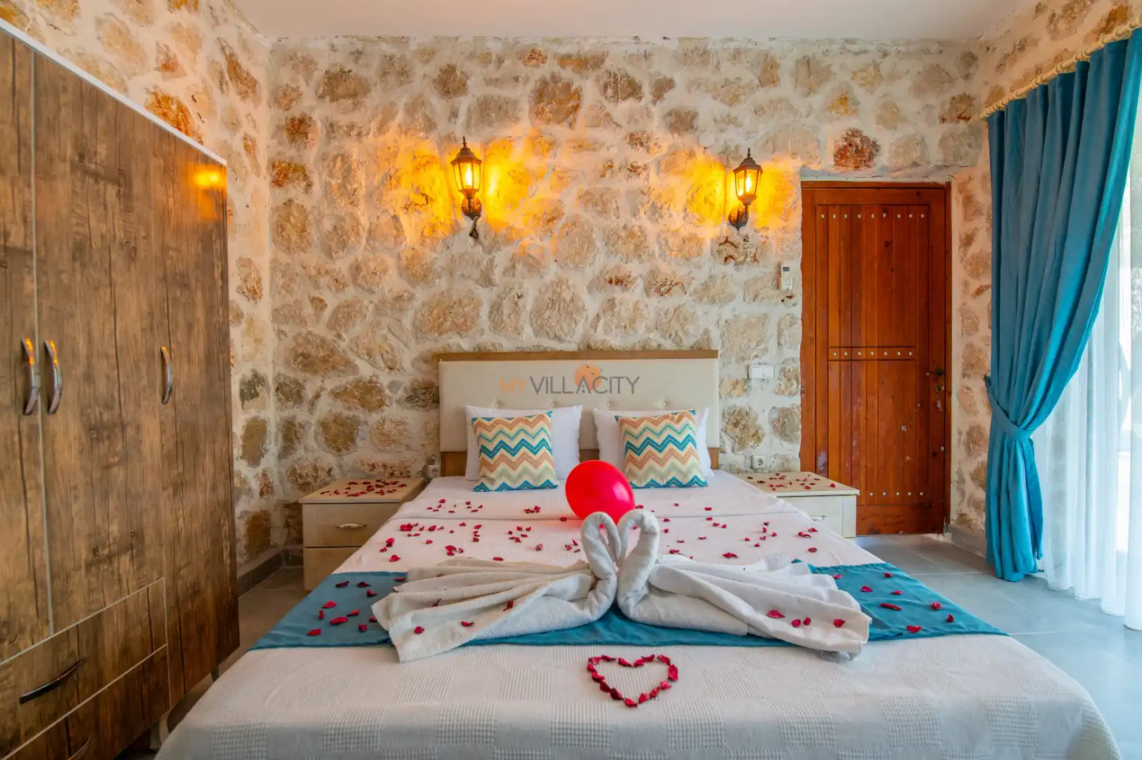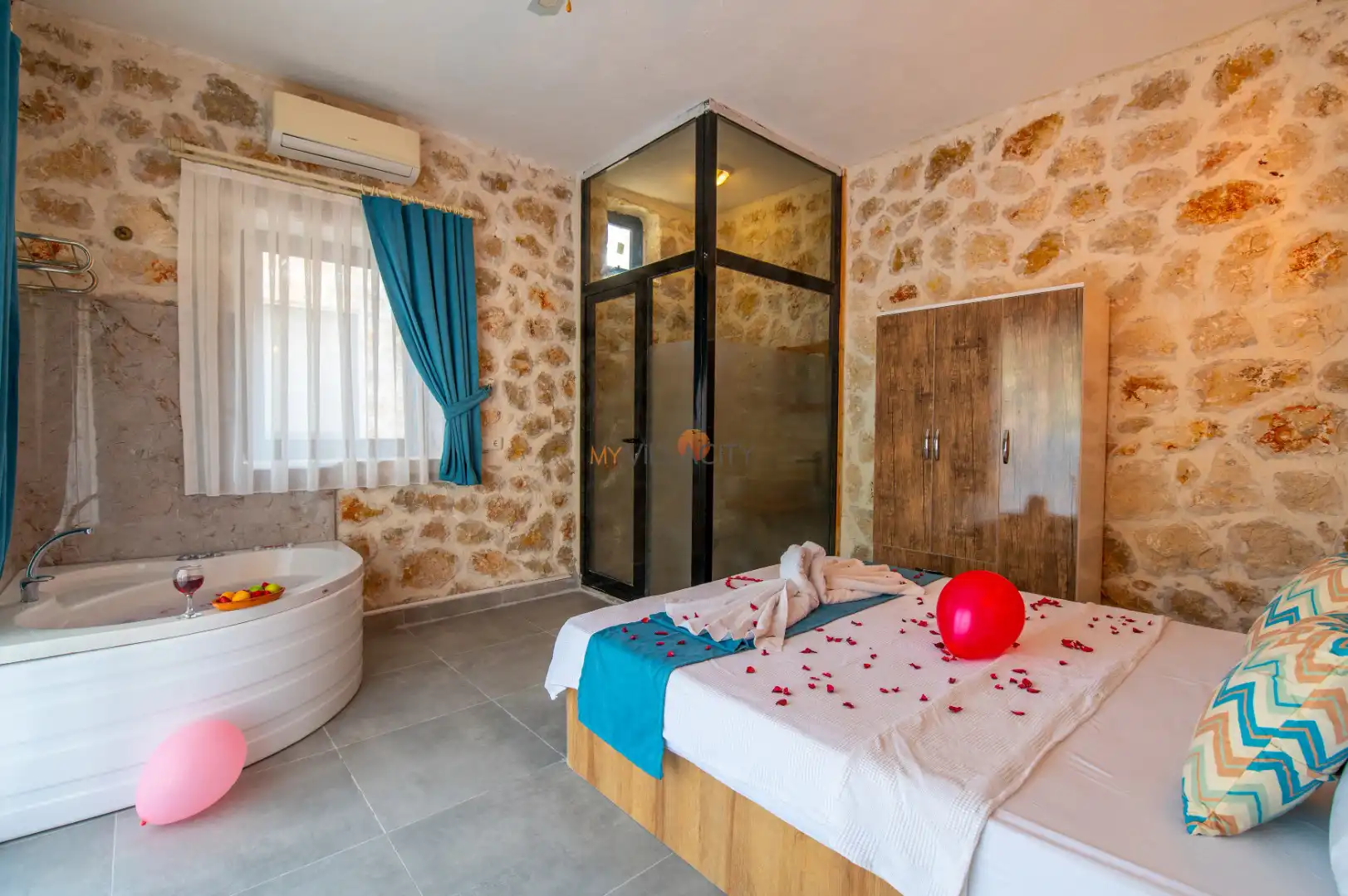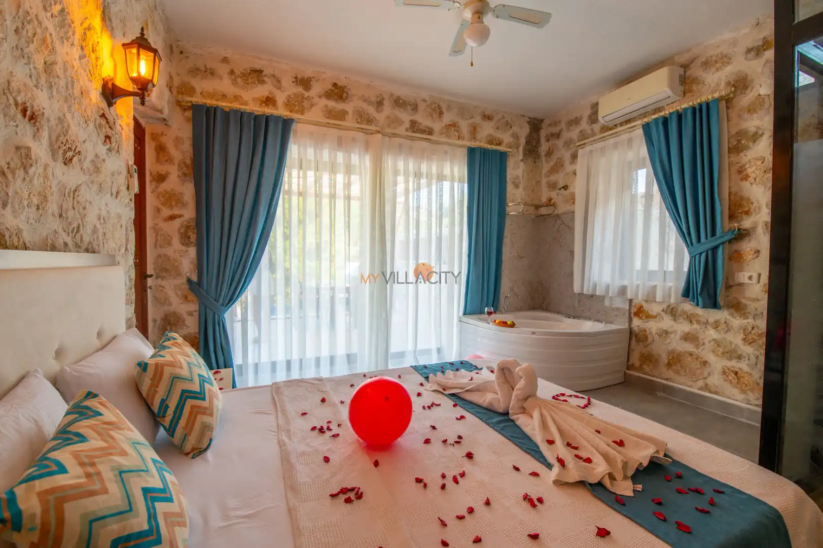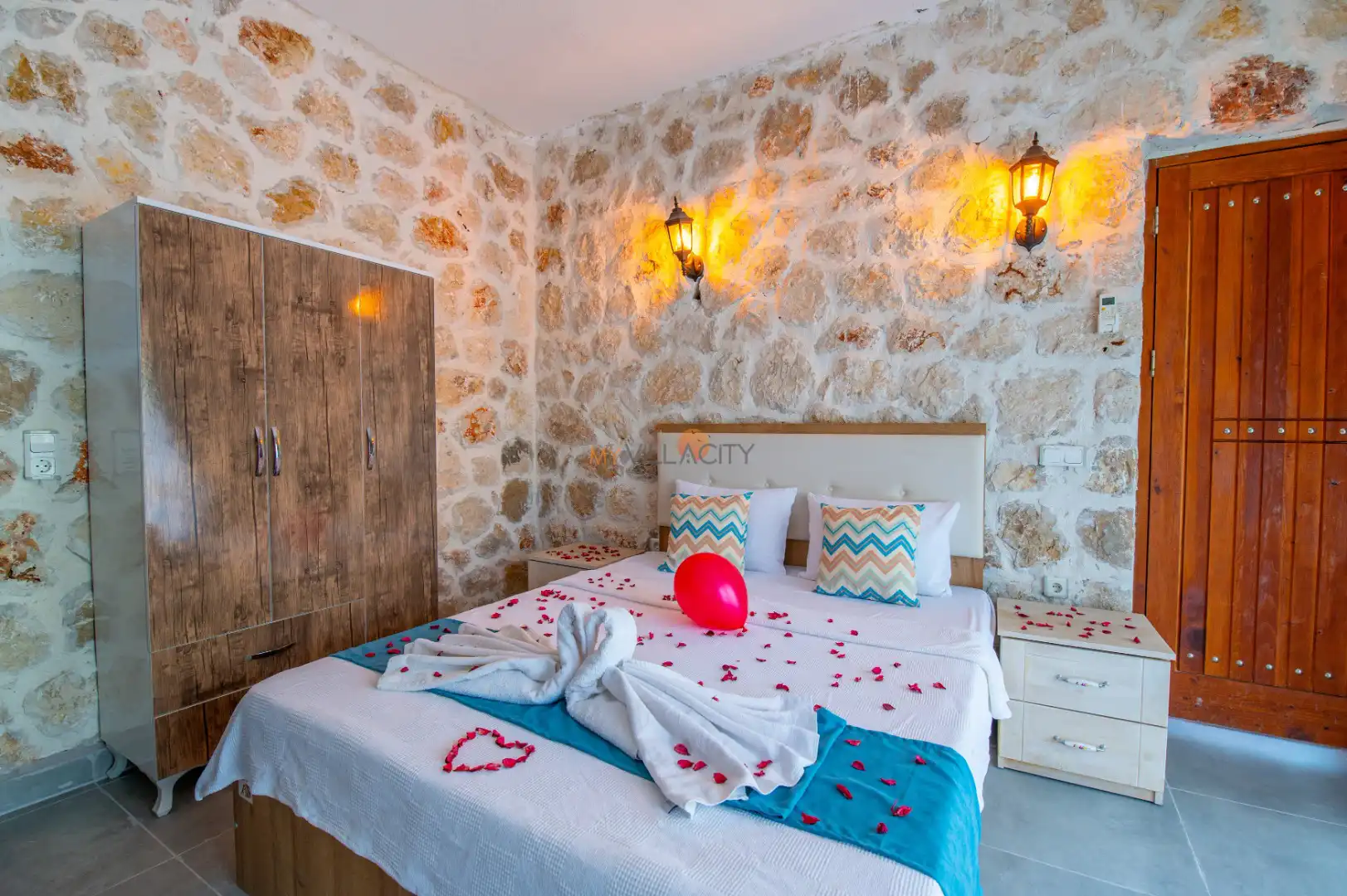 - 1 Çift Kişilik Yatak, 1 Jakuzi, 1 Banyo/WC, 2 Komodin, Elbise dolabı, Makyaj Masası, Klima,