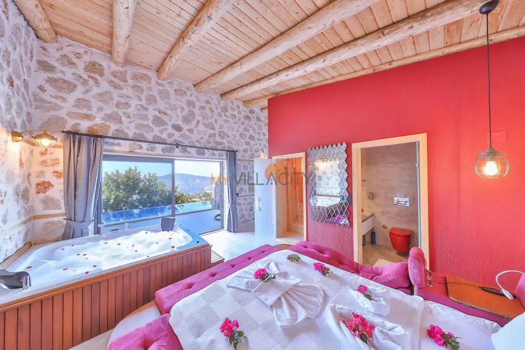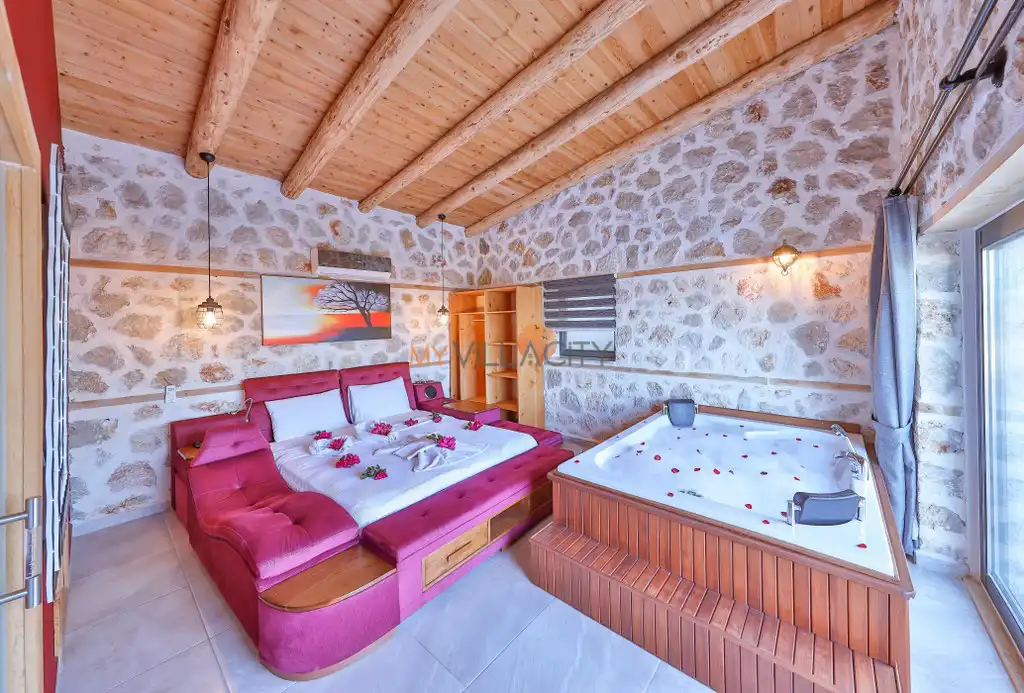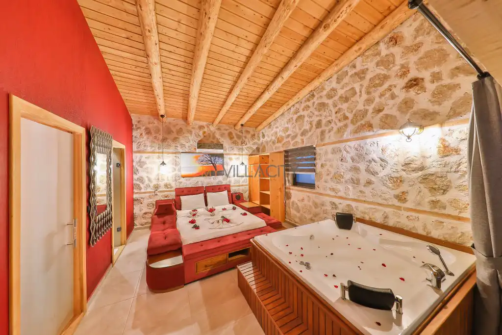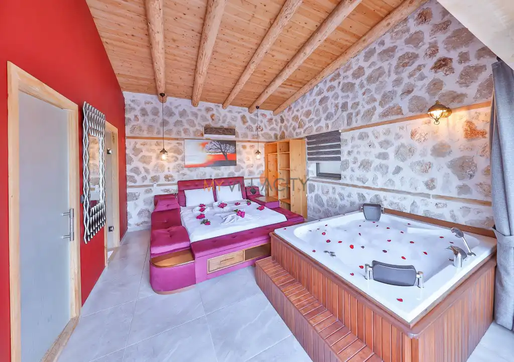 1 Çift Kişilik Yatak, 1 Jakuzi, 1 Banyo/WC, 2 Komodin, Elbise dolabı, Makyaj Masası, Klima,