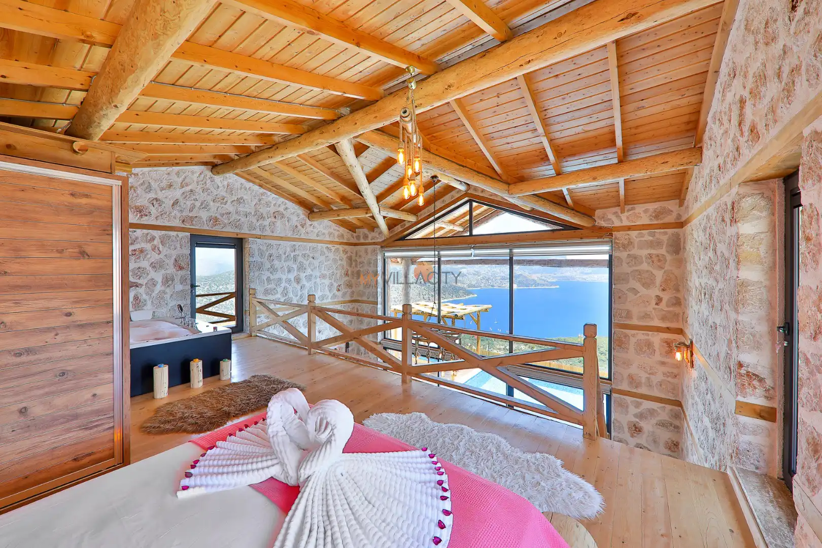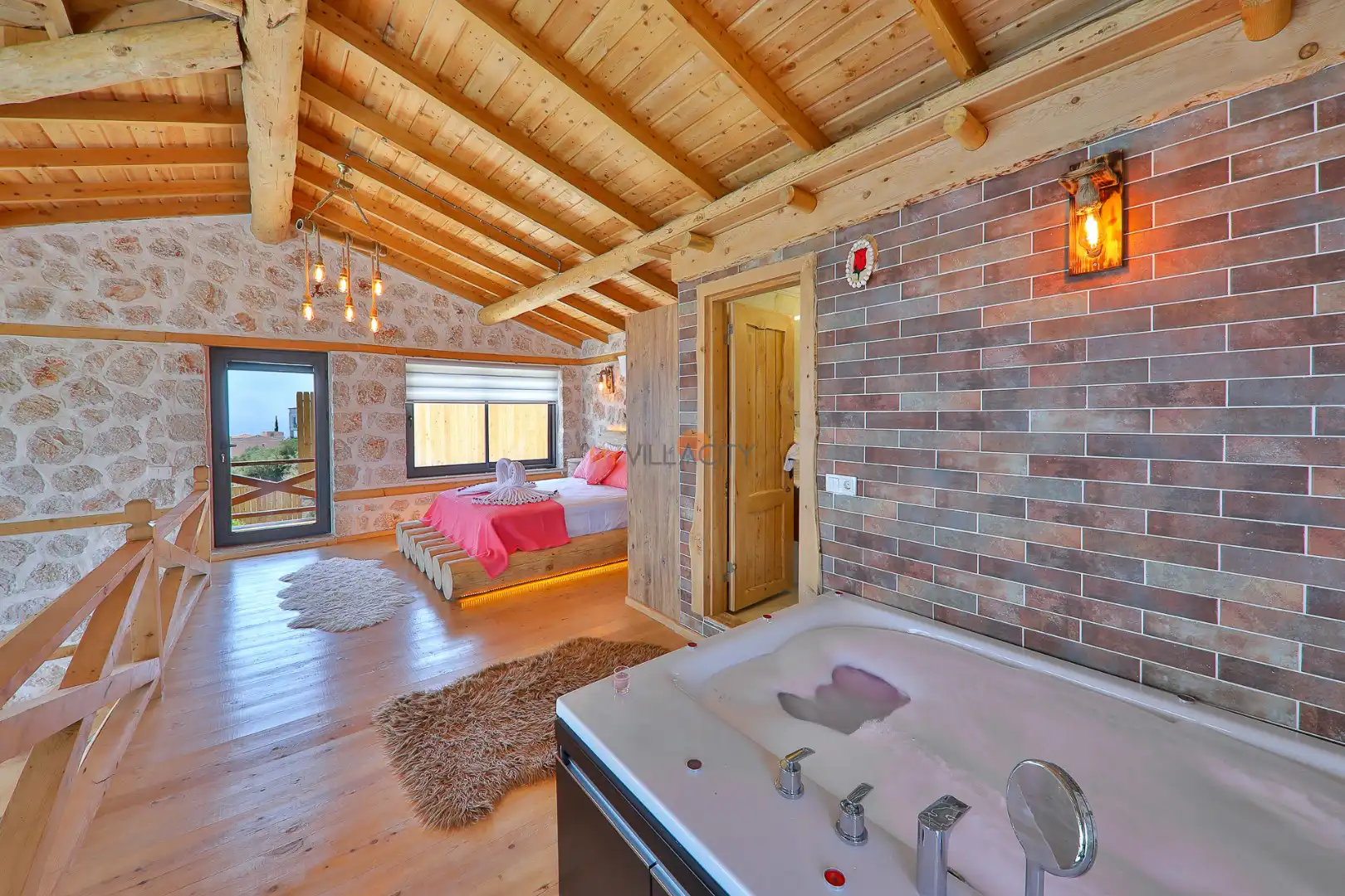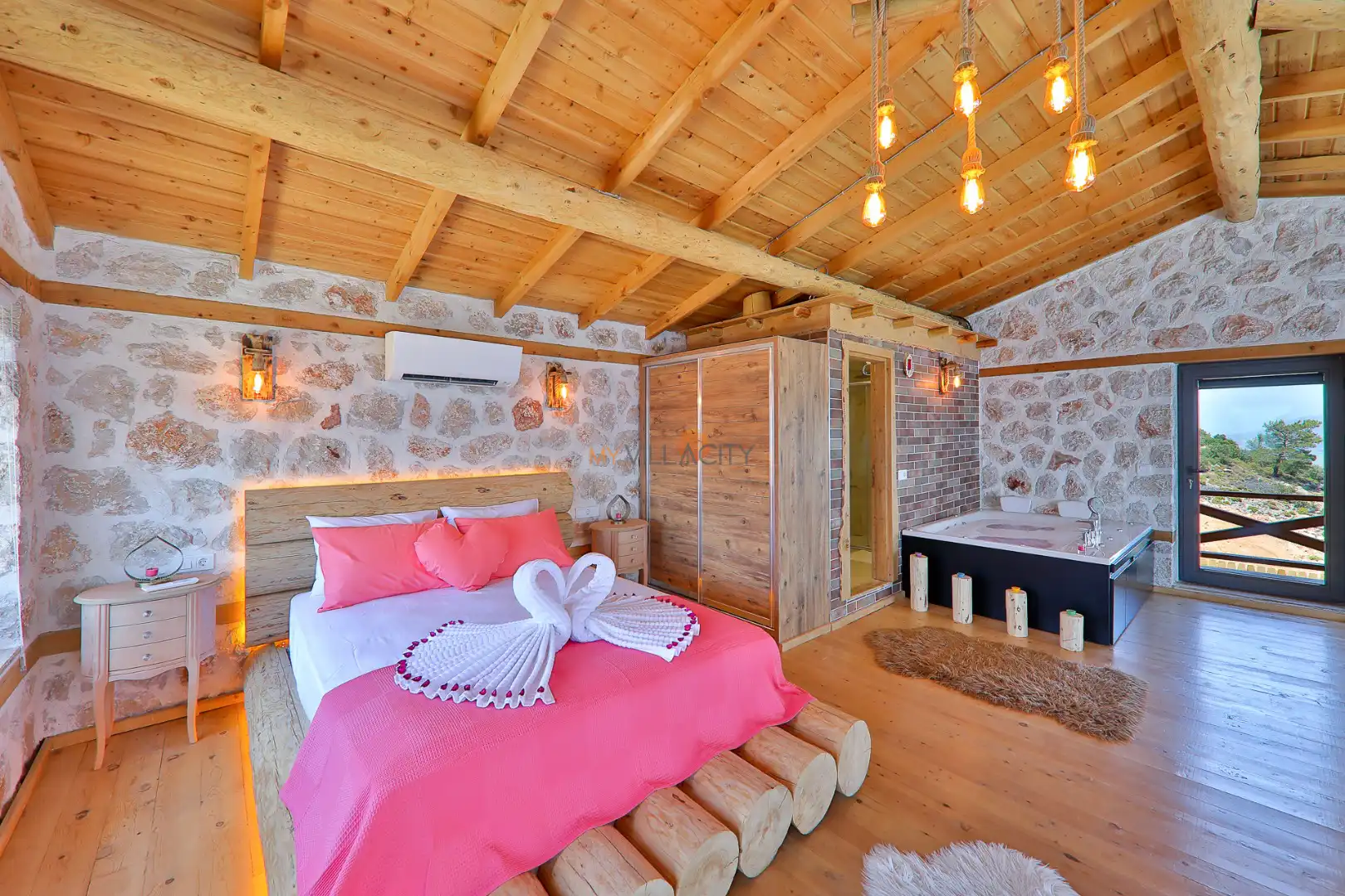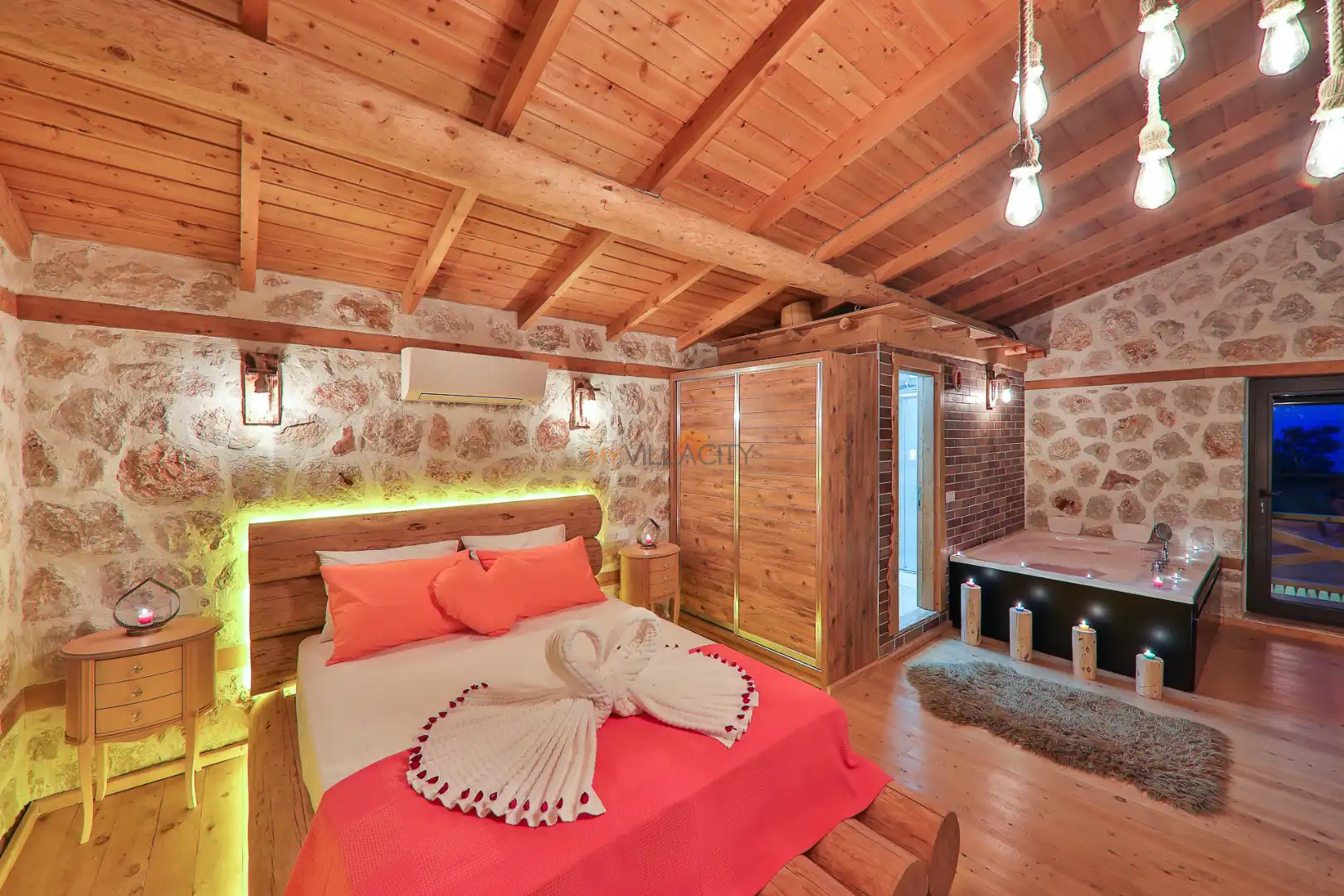 - 1 Çift Kişilik Yatak, 1 Jakuzi, 1 Banyo/WC, 2 Komodin, Elbise dolabı, Makyaj Masası, Klima,